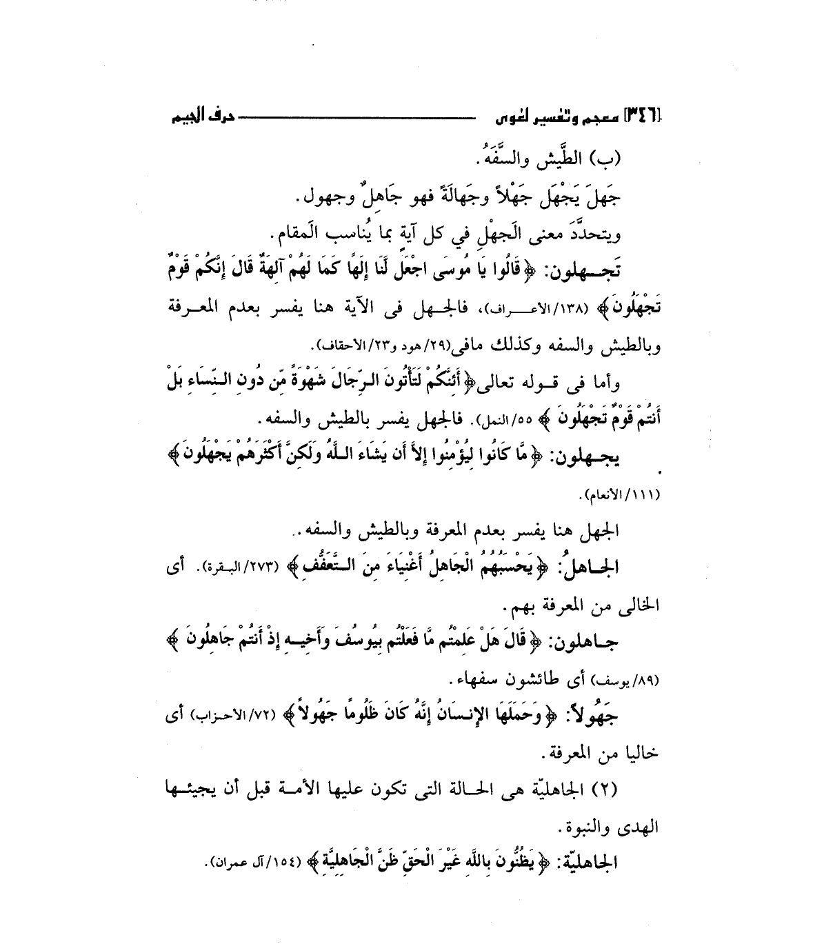 تجهلون: (قَالُوا يَا مُوسَى اجْعَل لَنَا إِلَهاً كَمَا لَهُمْ آلِهَةٌ قَالَ إِنَّكُمْ قَوْمٌ تَجْهَلُونَ) "138/الأعراف " فالجهل في الآية هنا يفسر بعدم المعرفة وبالطش والسفه وكذلك ما في (29/هود و23/الأحقاف ".