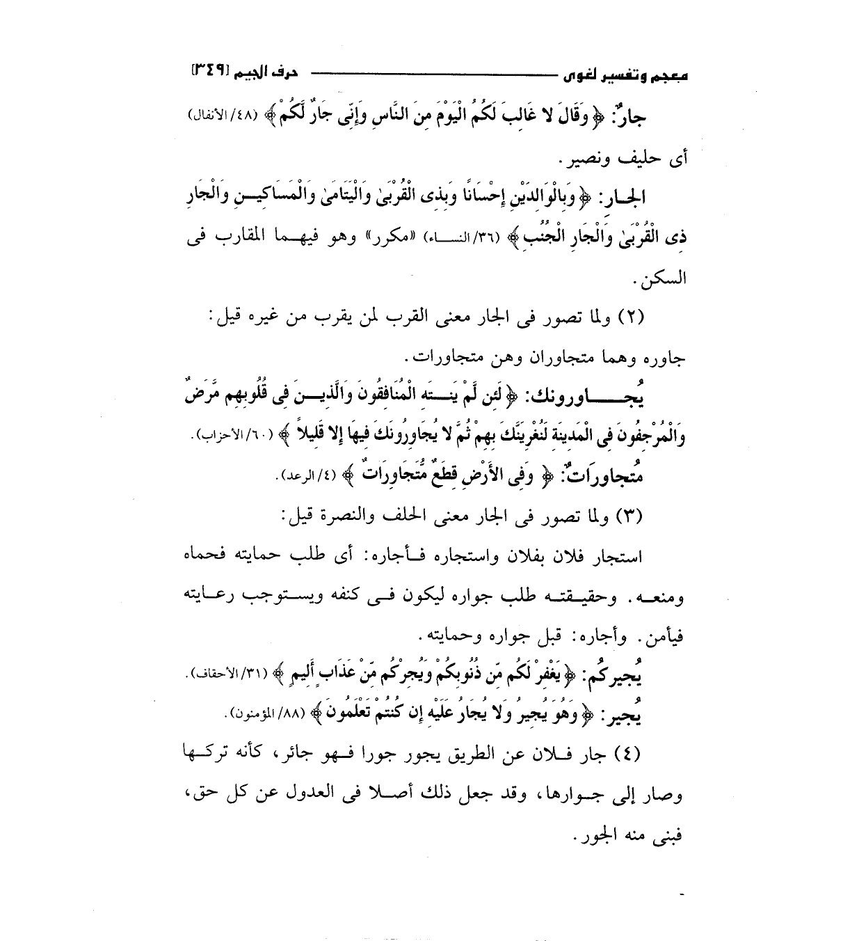 جار: (وَقَالَ لا غَالِبَ لَكُمْ الْيَوْمَ مِنْ النَّاسِ وَإِنِّي جَارٌ لَكُمْ) "48/الأنفال "أي حليف ونصير.
