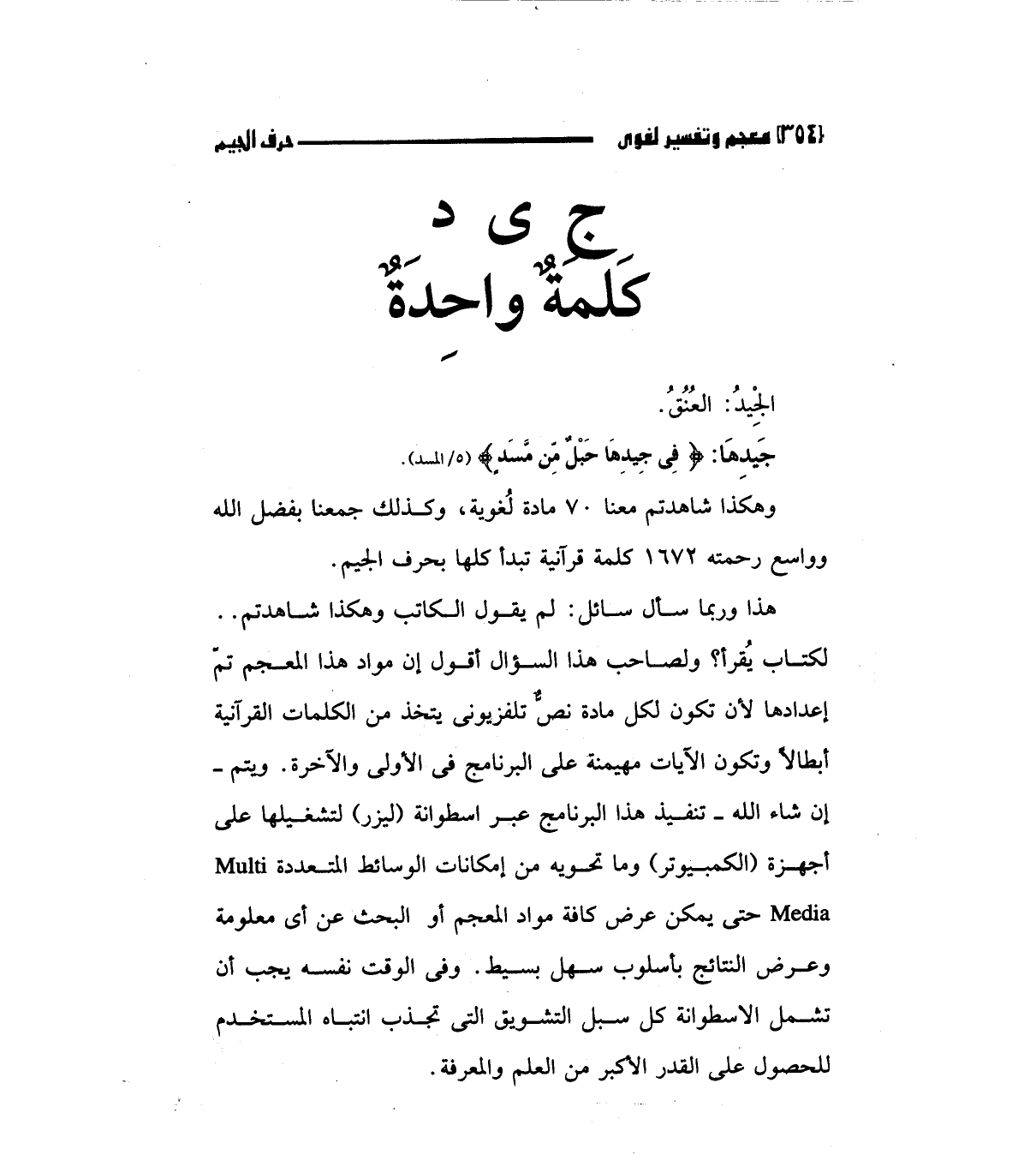 لكتاب يقرأ؟ ولصاحب هذا السؤال أقول إن مواد هذا المعجم تم إعدادها لأن تكون لكل مادة نص تلفزيوني يتخذ من الكلمات القرآنية أبطالا وتكون الآيات مهيمنة علي البرنامج في الأولي والآخرة. ويتم - إن شاء الله - تنفيذ هذا البرنامج عبر اسطوانة (ليزر) لتشغيلها علي أجهزة (الكمبيوتر) وما تحويه من إمكانات الوسائط المتعددة multi media