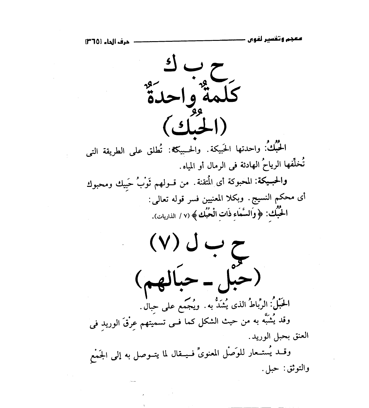 الحبك: واحدتها الحبيكة. والحبيكة: تطلق علي الطريقة التي تخلفها الرياح الهادئة في الرمال أو المياه.