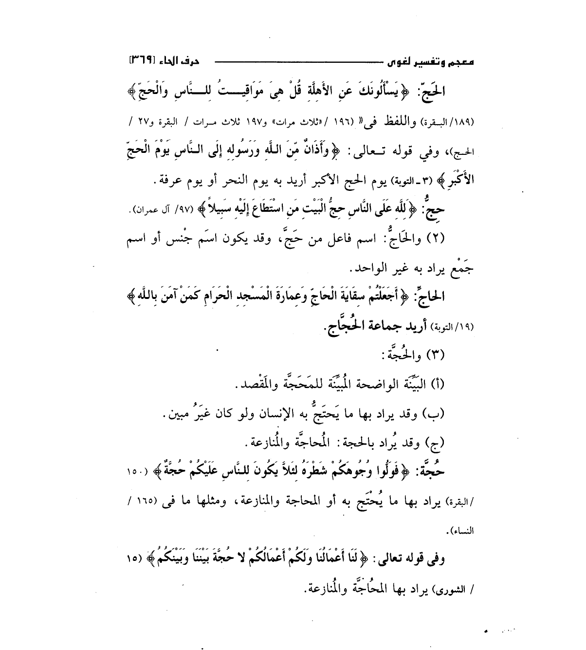 حجة: (فَوَلُّوا وُجُوهَكُمْ شَطْرَهُ لِئَلاَّ يَكُونَ لِلنَّاسِ عَلَيْكُمْ حُجَّةٌ) "150/البقرة " يراد بها ما يحتج به أو المحاجة والمنازعة، ومثلها ما في "165/النساء ".