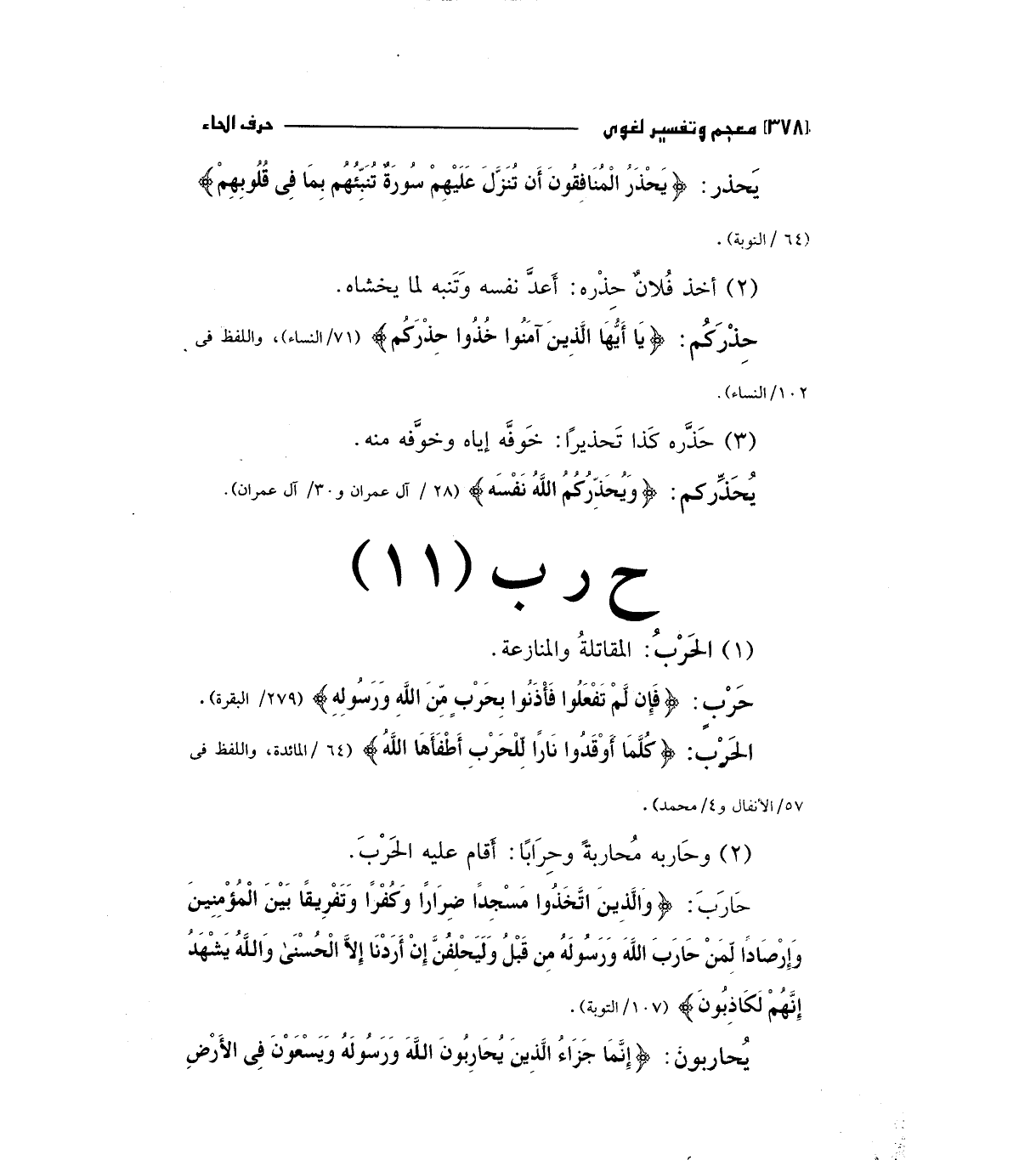 حارب: (وَالَّذِينَ اتَّخَذُوا مَسْجِداً ضِرَاراً وَكُفْراً وَتَفْرِيقاً بَيْنَ الْمُؤْمِنِينَ وَإِرْصَاداً لِمَنْ حَارَبَ اللَّهَ وَرَسُولَهُ مِنْ قَبْلُ وَلَيَحْلِفُنَّ إِنْ أَرَدْنَا إِلاَّ الْحُسْنَى وَاللَّهُ يَشْهَدُ إِنَّهُمْ لَكَاذِبُونَ) "107/التوبة ".