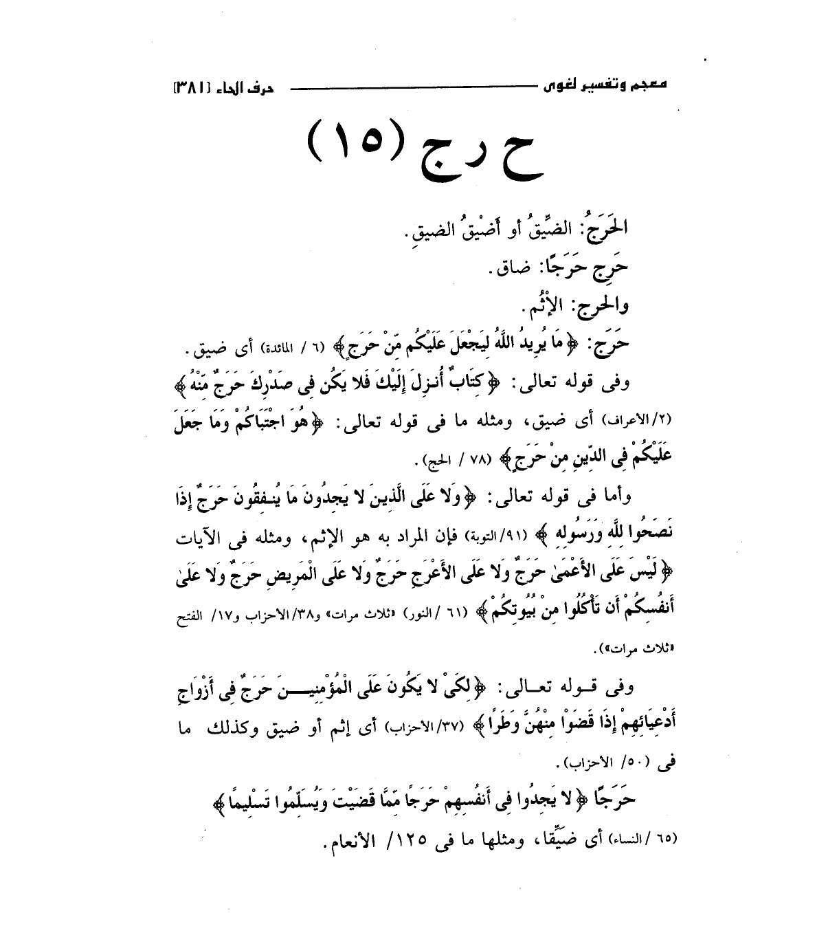 حرج: (مَا يُرِيدُ اللَّهُ لِيَجْعَلَ عَلَيْكُمْ مِنْ حَرَجٍ) "6/المائدة "أي ضيق وفي قوله تعالي: (كِتَابٌ أُنزِلَ إِلَيْكَ فَلا يَكُنْ فِي صَدْرِكَ حَرَجٌ مِنْهُ) " 2/الأعراف " أي ضيق، ومثله ما في قوله: (هُوَ اجْتَبَاكُمْ وَمَا جَعَلَ عَلَيْكُمْ فِي الدِّينِ مِنْ حَرَجٍ) "78/الحج".