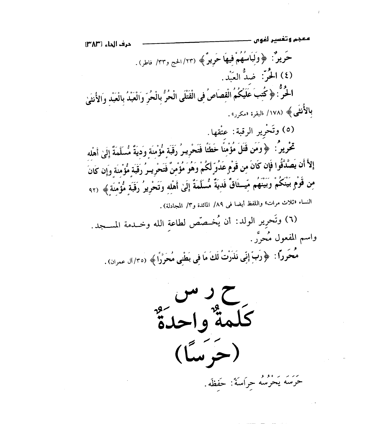 تحرير: (وَمَنْ قَتَلَ مُؤْمِناً خَطَأً فَتَحْرِيرُ رَقَبَةٍ مُؤْمِنَةٍ وَدِيَةٌ مُسَلَّمَةٌ إِلَى أَهْلِهِ إِلاَّ أَنْ يَصَّدَّقُوا فَإِنْ كَانَ مِنْ قَوْمٍ عَدُوٍّ لَكُمْ وَهُوَ مُؤْمِنٌ فَتَحْرِيرُ رَقَبَةٍ مُؤْمِنَةٍ وَإِنْ كَانَ مِنْ قَوْمٍ بَيْنَكُمْ وَبَيْنَهُمْ مِيثَاقٌ فَدِيَةٌ مُسَلَّمَةٌ إِلَى أَهْلِهِ وَتَحْرِيرُ رَقَبَةٍ مُؤْمِنَةٍ) "92/النساء " ثلاث مرات " واللفظ أيضا لأفي 89/المائدة و 3/ المجادلة ".