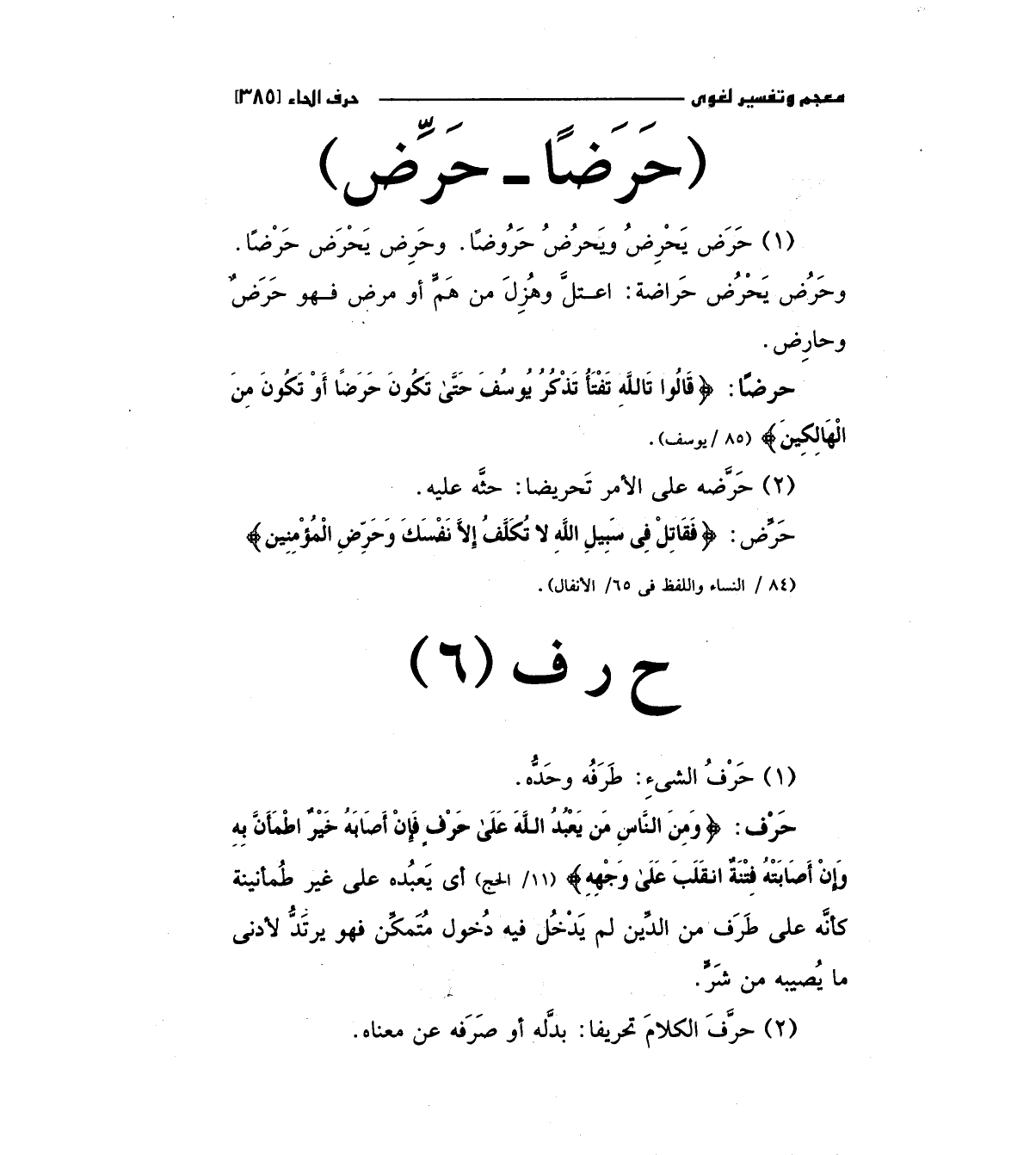 حرف: (وَمِنْ النَّاسِ مَنْ يَعْبُدُ اللَّهَ عَلَى حَرْفٍ فَإِنْ أَصَابَهُ خَيْرٌ اطْمَأَنَّ بِهِ وَإِنْ أَصَابَتْهُ فِتْنَةٌ انقَلَبَ عَلَى وَجْهِهِ) "11/الحج" أي يعبده علي غير طمأنينة كأنه علي طرف من الدين لم يدخل فيه دخول متمكن فهو يرتد لأدني ما يصيبه من شر.