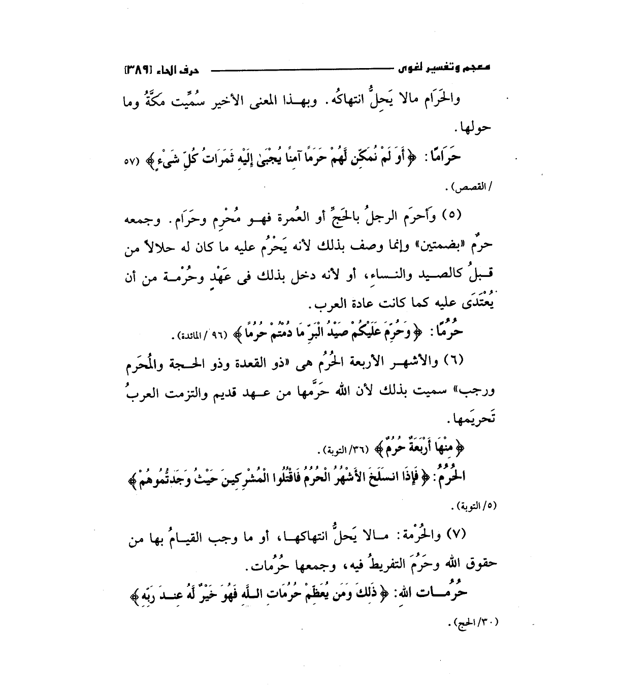 7 - والحرمة: مالا يحل انتهاكها، أو ما وجب القيام بها من حقوق الله وحرم التفريط فيه، وجمعها حرمات.