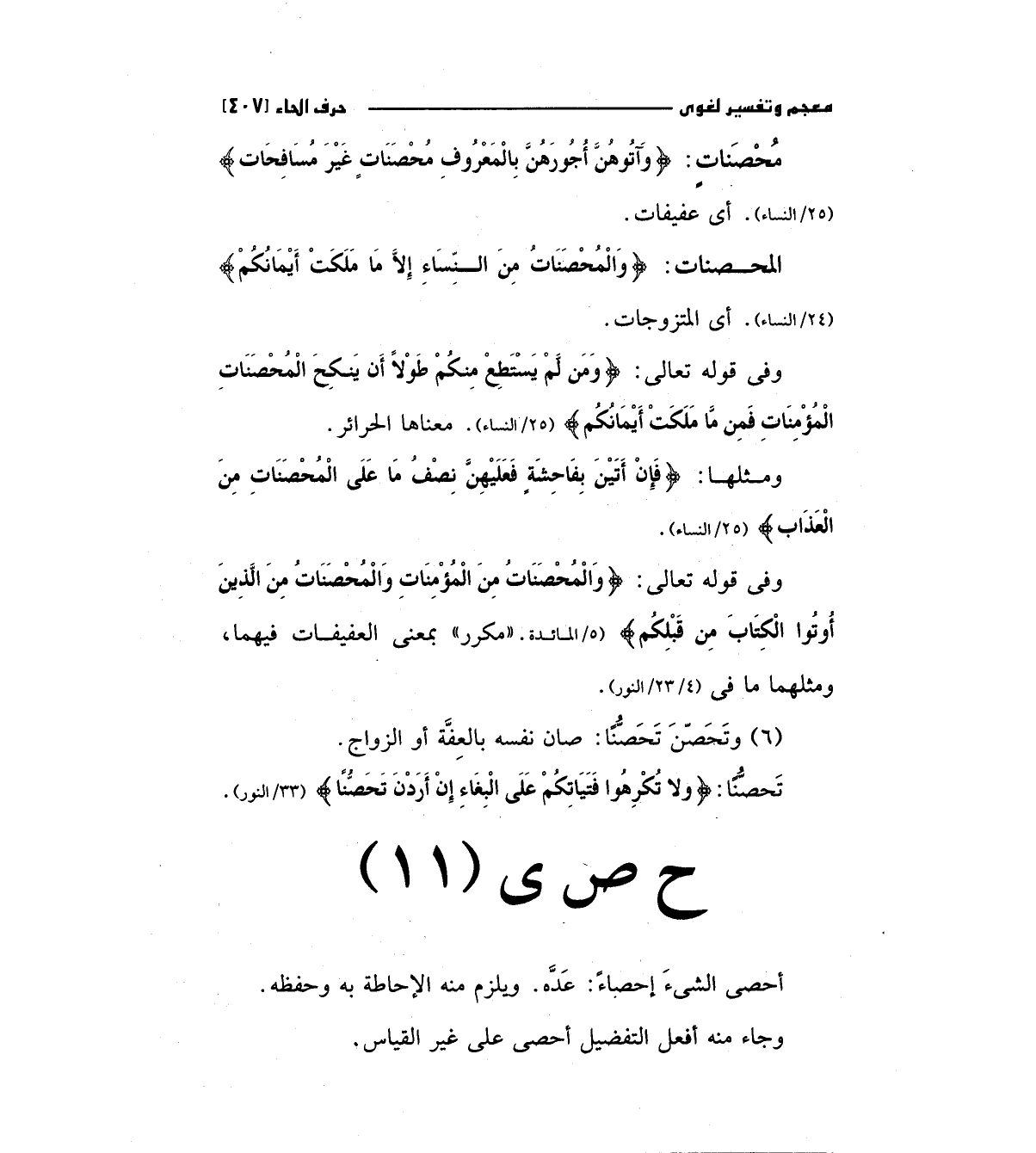 المحصنات: (وَمَنْ لَمْ يَسْتَطِعْ مِنْكُمْ طَوْلاً أَنْ يَنكِحَ الْمُحْصَنَاتِ الْمُؤْمِنَاتِ فَمِنْ مَا مَلَكَتْ أَيْمَانُكُمْ) "25/النساء " معناها الحرائر ".