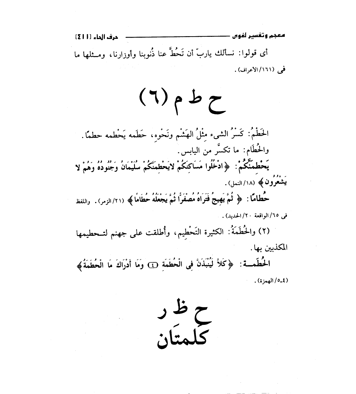 حطاما: (ثُمَّ يَهِيجُ فَتَرَاهُ مُصْفَرّاً ثُمَّ يَجْعَلُهُ حُطَاماً) "21/الزمر" واللفظ في 65/الواقعة 20/الحديد ".