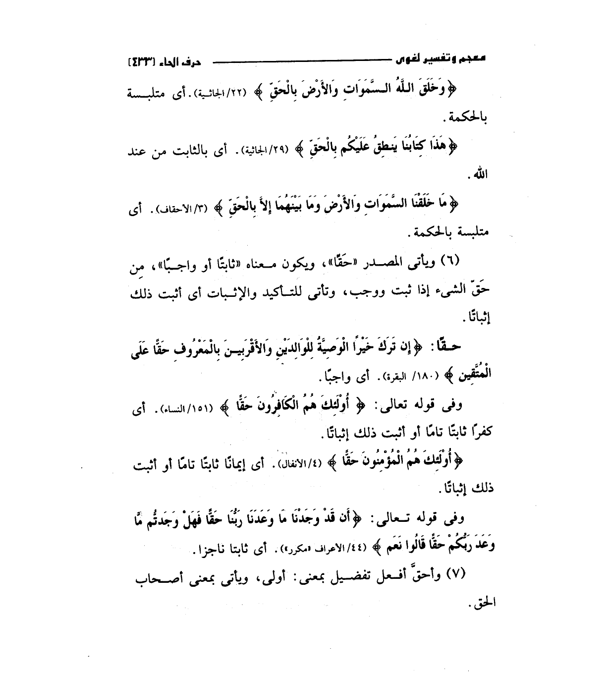6 - ويأتي المصدر "حقا" ويكون معناه "ثابتا أو واجبا" من حق الشئ) "3/الحقاف " أي متلبسة بالحكمة.