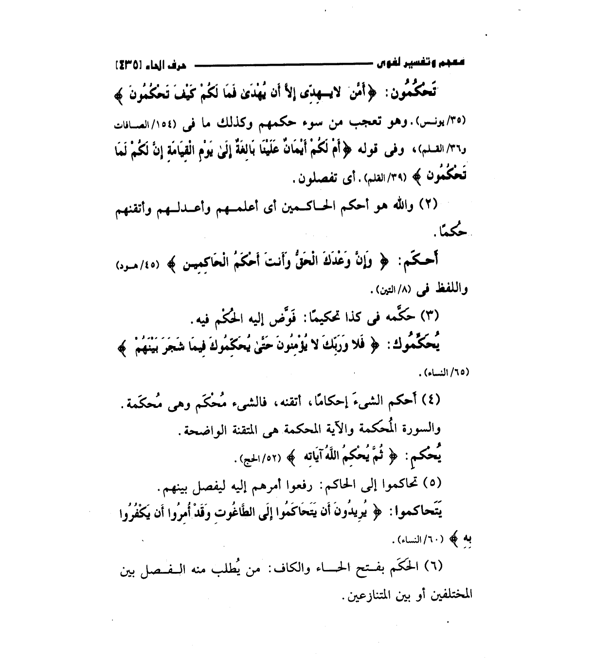 تحكمون: (أَمَّنْ لا يَهِدِّي إِلاَّ أَنْ يُهْدَى فَمَا لَكُمْ كَيْفَ تَحْكُمُونَ) (35/يونس). وهو تعجب من سوء حكمهم وكذلك ما فى (154 / الصافات و36 القلم)، وفى قوله (أَمْ لَكُمْ أَيْمَانٌ عَلَيْنَا بَالِغَةٌ إِلَى يَوْمِ الْقِيَامَةِ إِنَّ لَكُمْ لَمَا تَحْكُمُونَ) (39/ القلم) أى تفصلون.
