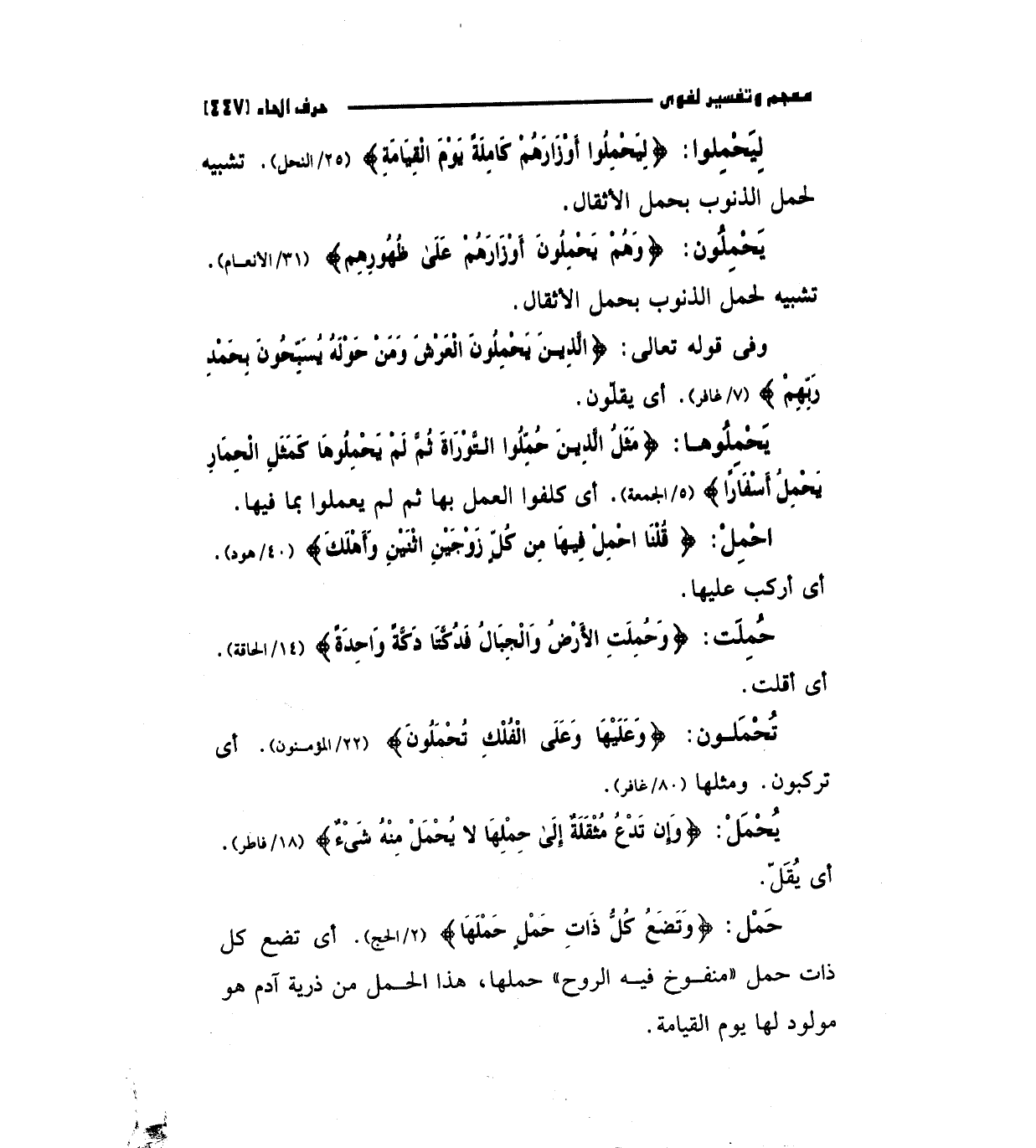 حمل: (وَتَضَعُ كُلُّ ذَاتِ حَمْلٍ حَمْلَهَا) (2/ الحج) أى تضع كل ذات حمل " منفوخ فيه الروح " حملها، هذا الحمل من ذرية آدم هو مولود لها يوم القيامة.