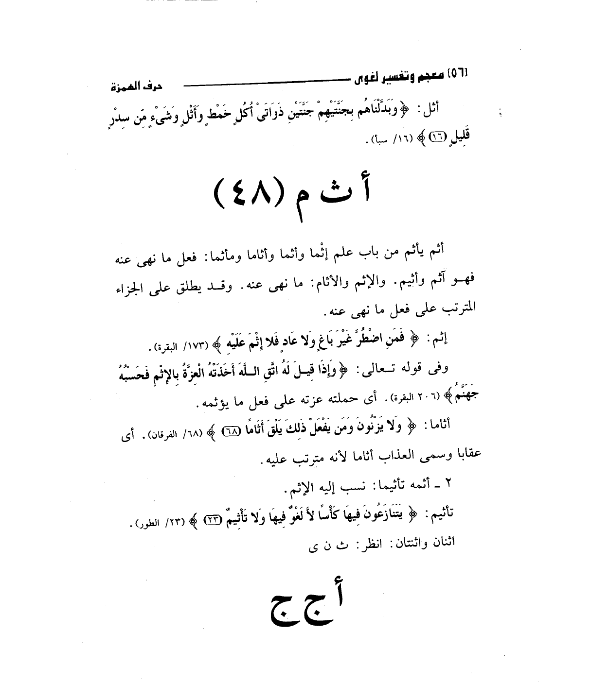أثاما: (وَلا يَزْنُونَ وَمَنْ يَفْعَلْ ذَلِكَ يَلْقَ أَثَاماً (68)) " 68/ الفرقان "أي عقابا وسمي العذاب أثاما لأنه مترتب عليه.