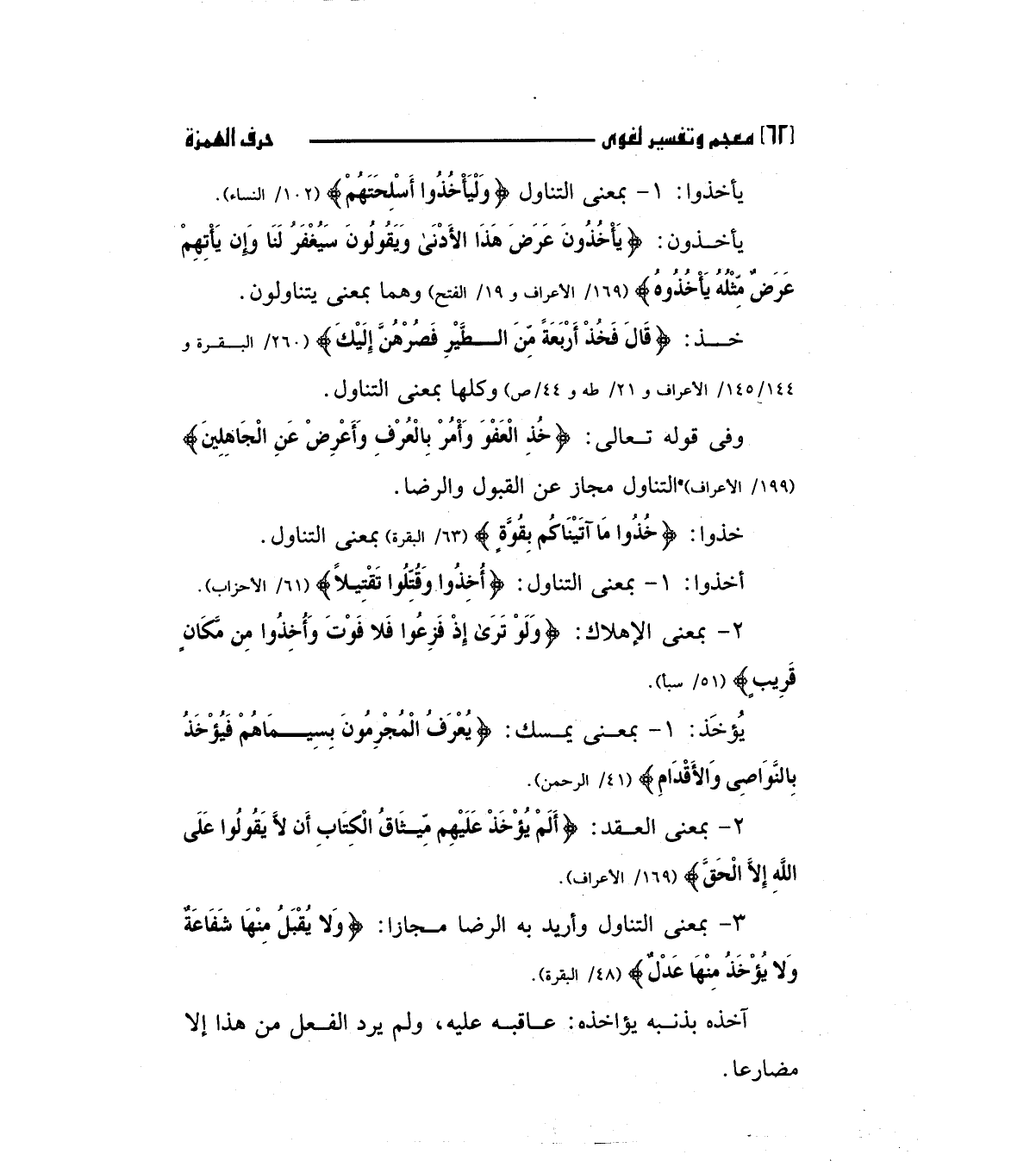 خذ: (قَالَ فَخُذْ أَرْبَعَةً مِنْ الطَّيْرِ فَصُرْهُنَّ إِلَيْكَ) "260/ البقرة و 144/ 145/الأعراف و 21 / طه و 44/ ص) وكلها التناول.