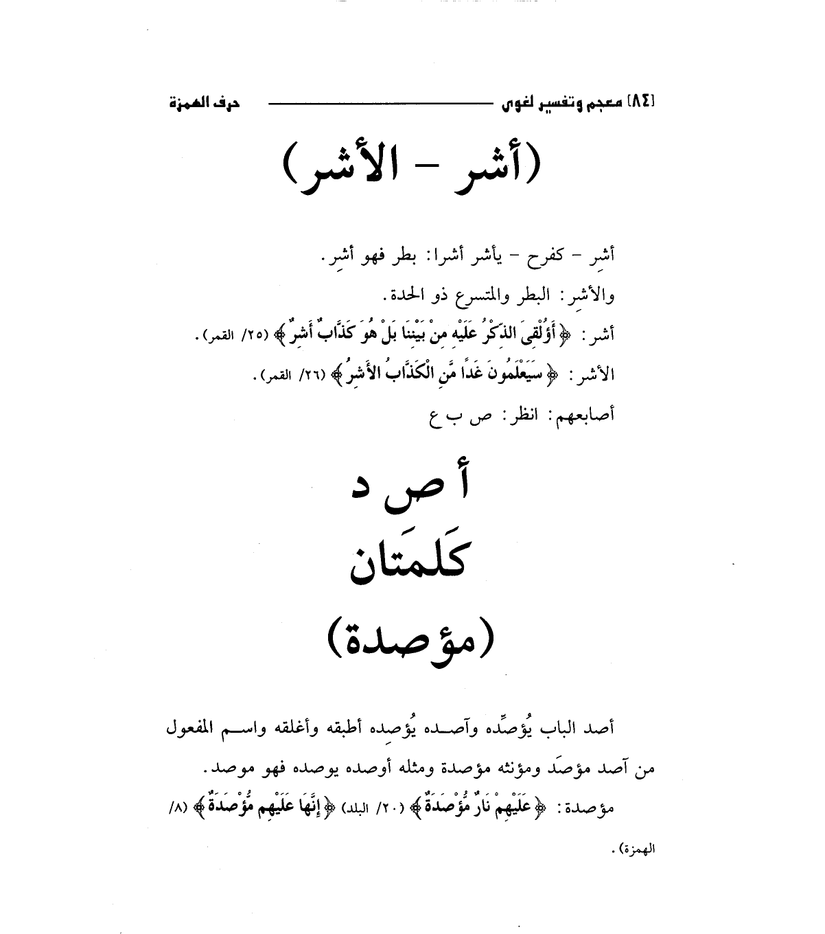 أصد الباب يؤصده وآصده يؤصده أطبقه وألقه واسم المفعول من أصد مؤ صد ومؤنثه مؤصدة ومثله أوصده يوصده فهو موصد. مؤصدة: (عَلَيٌهمٌ نَارٌ مٌؤصَدَةٌ) " 20/ البلد " (إنًهَا عَلَيم مٌؤصَدَةٌ) " 8/الهمزة ".
