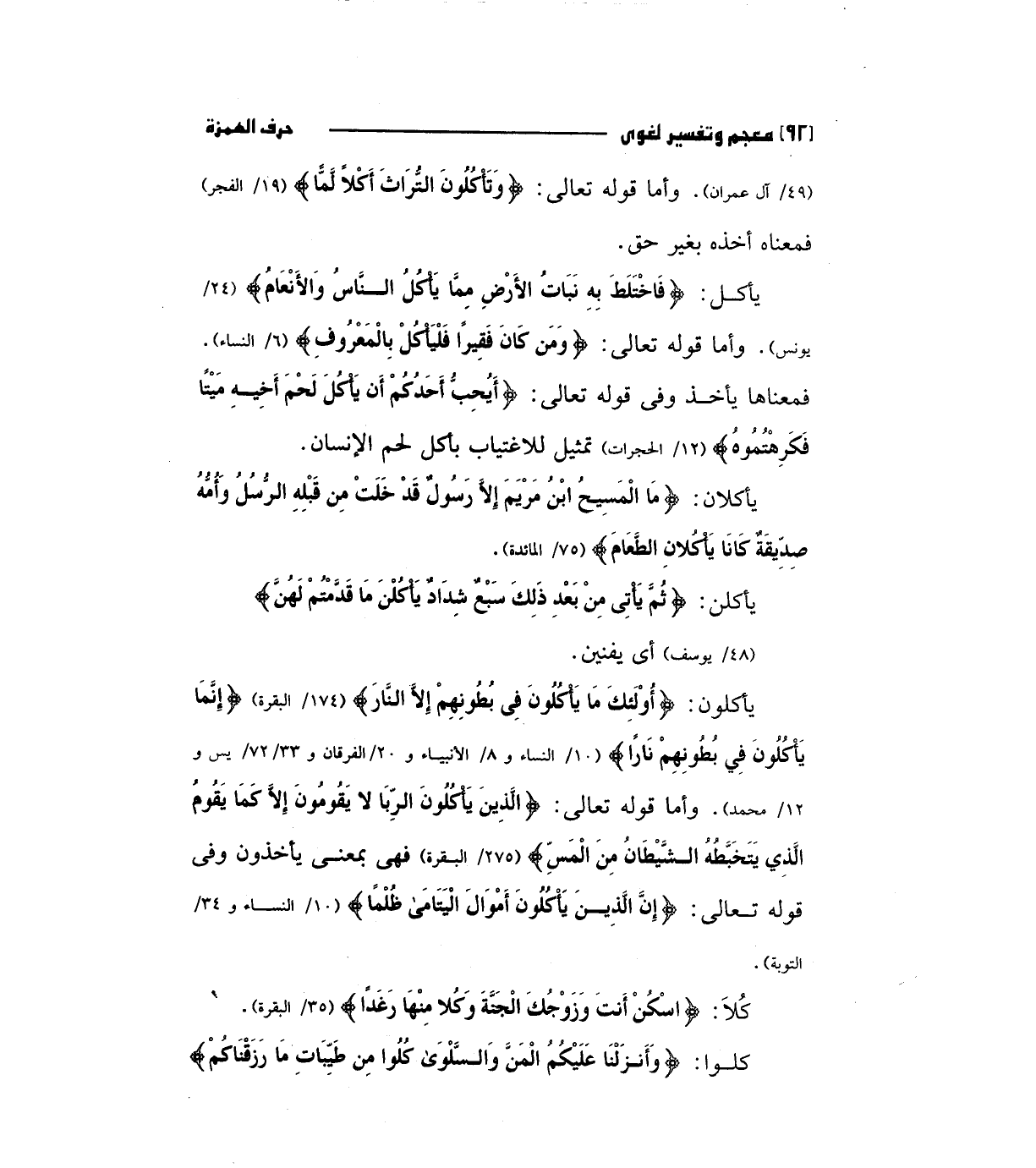 يأكلون: (أولئك ما يأكلون في بطونهم إلا النار) " 174/ البقرة " (إِنَّمَا يَأْكُلُونَ فِي بُطُونِهِمْ نَاراً) " 10/ النساء و 8 / الأنبياء و 20 الفرقان و 33/ 72/يس و12/ محمد ". وأما قوله تعالي: (الَّذِينَ يَأْكُلُونَ الرِّبَا لا يَقُومُونَ إِلاَّ كَمَا يَقُومُ الَّذِي يَتَخَبَّطُهُ الشَّيْطَانُ مِنْ الْمَسِّ) " 275/ البقرة " فهي بمعني يأخذون وفي قوله تعالي: (إِنَّ الَّذِينَ يَأْكُلُونَ أَمْوَالَ الْيَتَامَى ظُلْماً) " 10/ النساء و 34/ التوبة ".