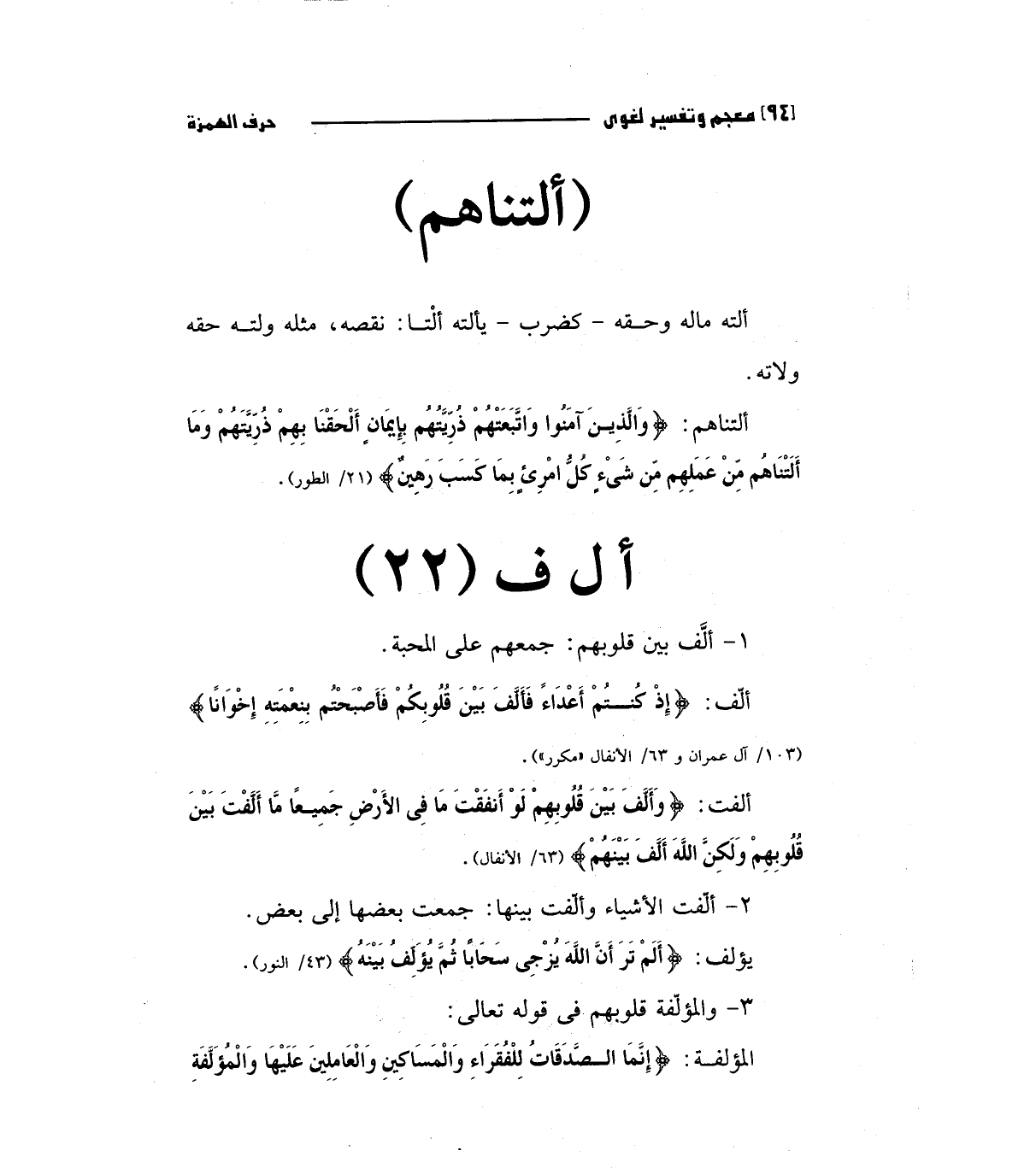 ألفت: (وَأَلَّفَ بَيْنَ قُلُوبِهِمْ لَوْ أَنفَقْتَ مَا فِي الأَرْضِ جَمِيعاً مَا أَلَّفْتَ بَيْنَ قُلُوبِهِمْ وَلَكِنَّ اللَّهَ أَلَّفَ بَيْنَهُمْ) "63/ الأنفال ".