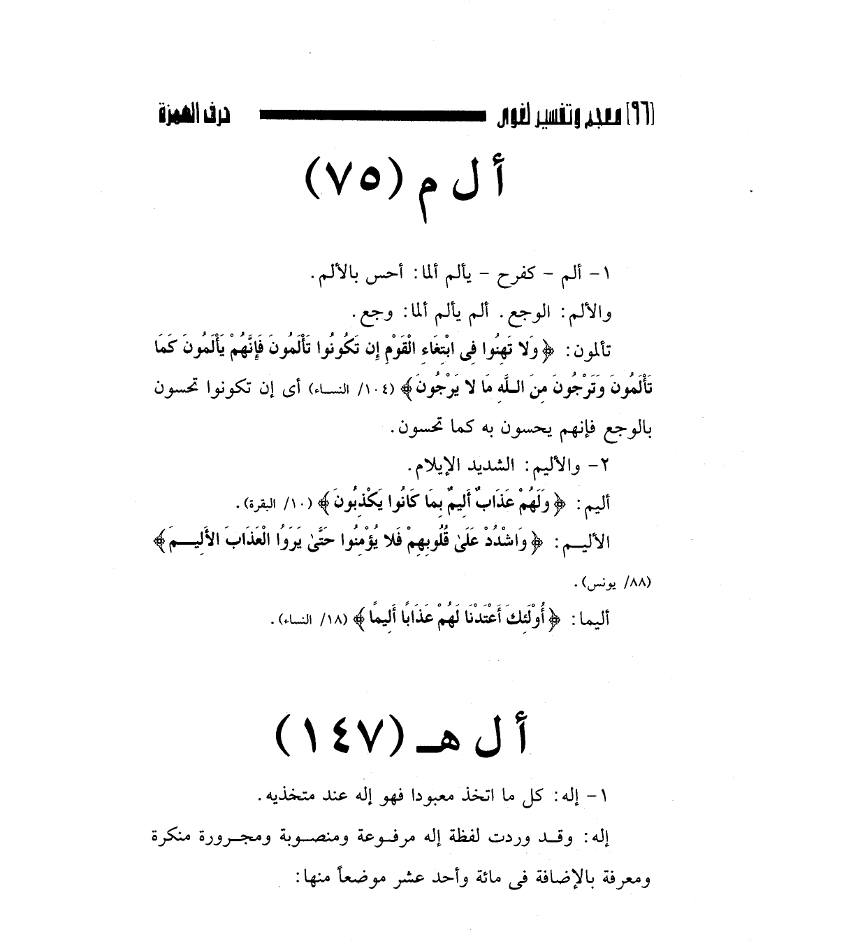 تألمون: (وَلا تَهِنُوا فِي ابْتِغَاءِ الْقَوْمِ إِنْ تَكُونُوا تَأْلَمُونَ فَإِنَّهُمْ يَأْلَمُونَ كَمَا تَأْلَمُونَ وَتَرْجُونَ مِنْ اللَّهِ مَا لا يَرْجُونَ) "104/ النساء " أي إن تكونوا تحسون بالوجع فإنهم يحسون به كما تحسون.