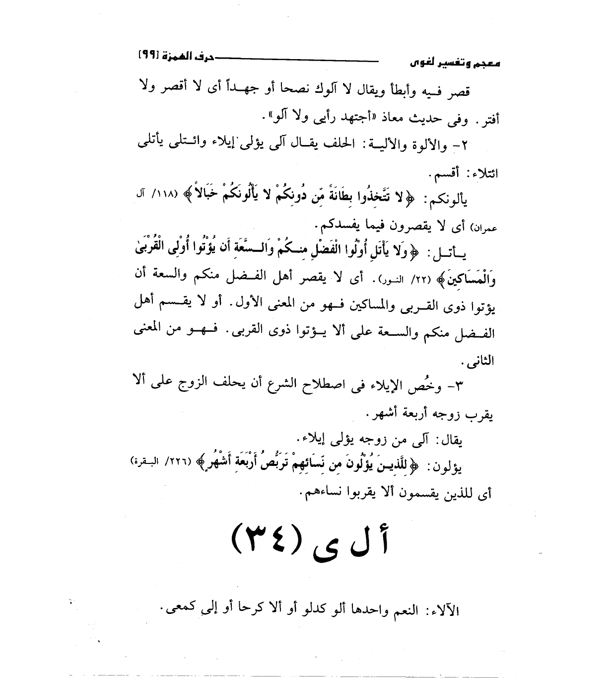 يأتل: (وَلا يَأْتَلِ أُوْلُوا الْفَضْلِ مِنْكُمْ وَالسَّعَةِ أَنْ يُؤْتُوا أُوْلِي الْقُرْبَى وَالْمَسَاكِينَ) " 22/ النور " أي لا يقصر أهل الفضل منكم والسعة أن يؤتوا ذوي الفربي والمساكين فهو من المعني الأول. أو لا يقسم أهل الفضل منكم والسعة علي ألا يؤتوا ذوي القربي. فهو من المعني الثاني.