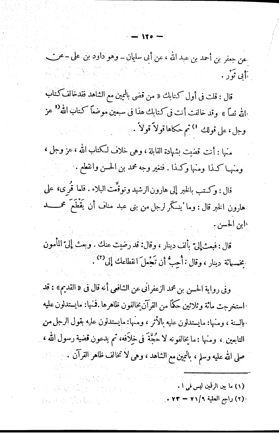وفي رواية الحسن بن محمد الزعفراني عن الشافعي أنه قال في «القديم»: قد استخرجت مائة وثلاثين حكماً من القرآن يخالفون ظاهرها. فمنها: ما يستدلون عليه بالسنة، ومنها: ما يستدلون عليه بالأثر، ومنها: ما يستدلون عليه بقول الرجل من التابعين. ومنها: ما يخالفونه لا حُجَّةَ في خِلاَفه، ثم يدعون قضية رسول الله، صلى الله عليه وسلم، باليمين مع الشاهد، وهي لا تخالف ظاهر القرآن.