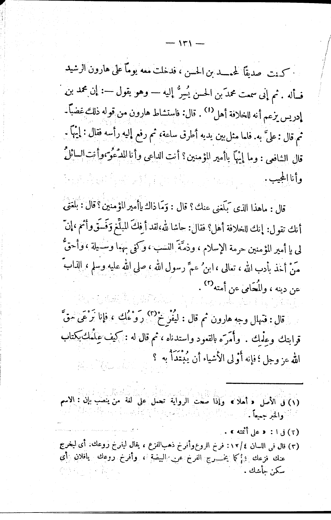 قال: فتهال وجه هارون ثم قال: ليُفْرِخْ (٣) رَوْعُك، فإنا نَرْعَى حقَّ قرابتك وعِلْمِك. وأَمَرَه بالقعود واستدناه، ثم قال له: كيف عِلْمك بكتاب الله عز وجل؛ فإنه أَوْلى الأشياء أن يُبْتَدَأَ به؟