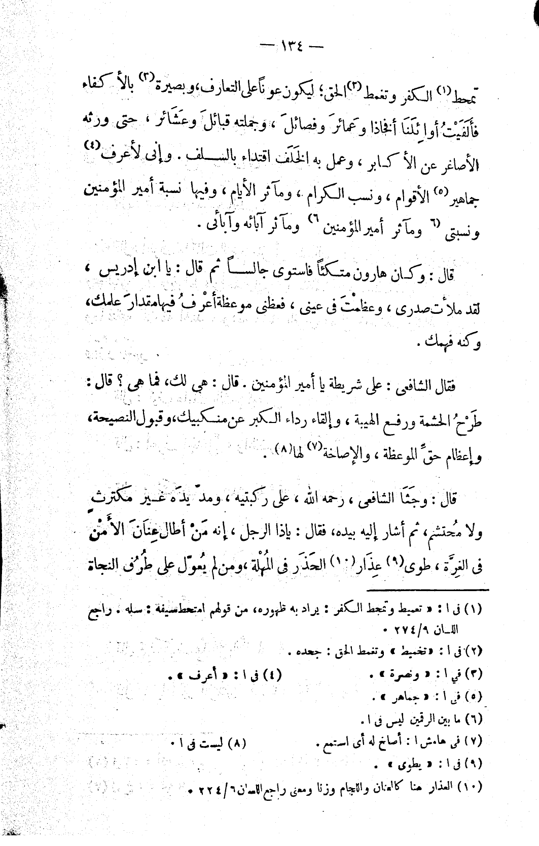 تمحط (١) الكفر وتغمط (٢) الحق؛ ليكون عوناً على التعارف، وبصيرة (٣) بالأكفاء فأَلَفَيْتُ أوائِلَنَا أفخاذا وعَمائرَ وفصائلَ، وجملته قبائلَ وعَشَائر، حتى ورثه الأصاغر عن الأكابر، وعمل به الخَلَف اقتداء بالسلف. وإني لأعرف (٤) جماهير (٥) الأقوام، ونسب الكرام، ومآثر الأيام، وفيها نسبة أمير المؤمنين ونسبتي (٦ ومآثر أمير المؤمنين ٦) ومآثر آبائه وآبائي.