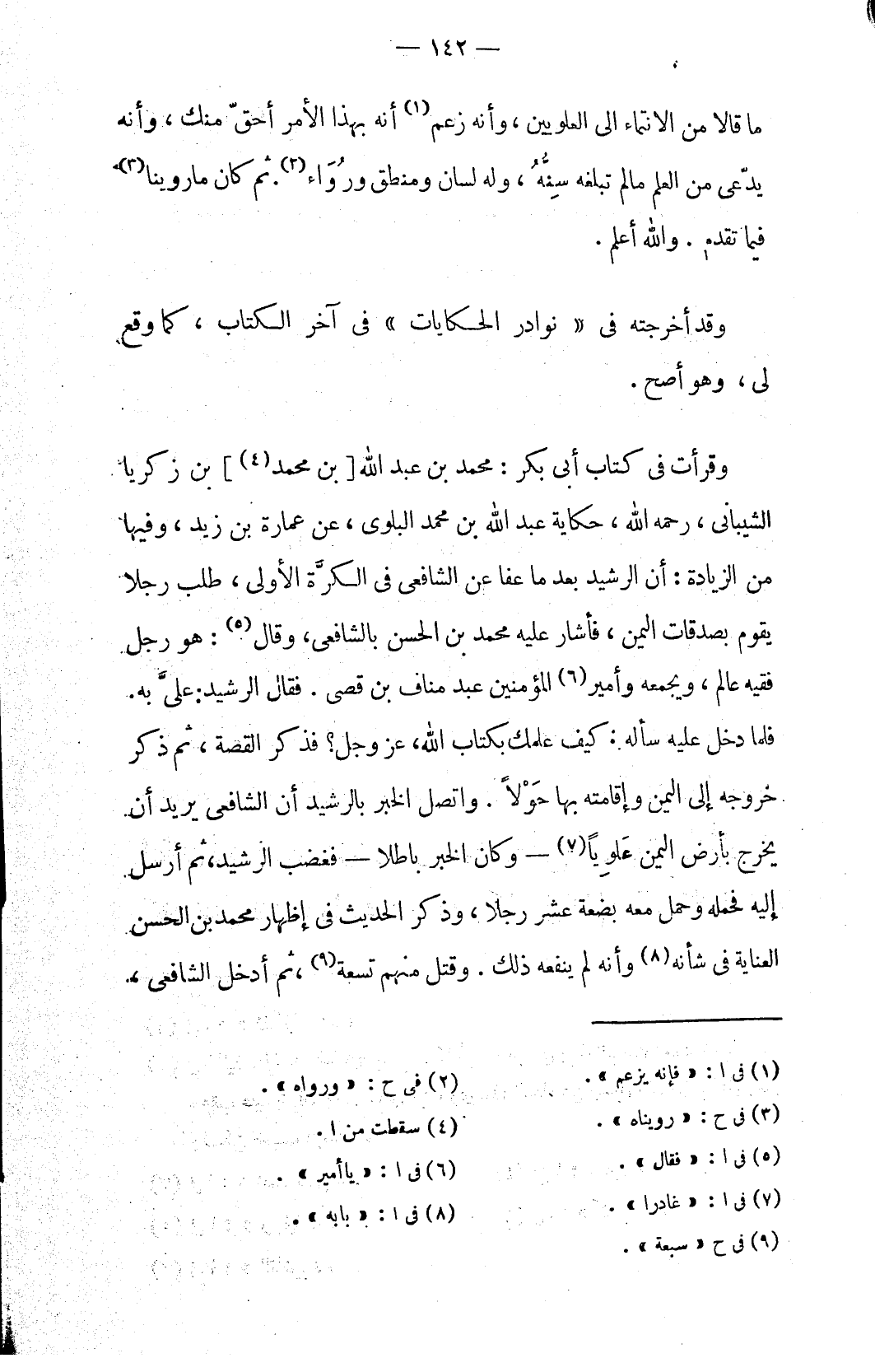 وقرأت في كتاب أبي بكر: محمد بن عبد الله [بن محمد (٤)] بن زكريا الشيباني، رحمه الله، حكاية عبد الله بن محمد البلوي، عن عمارة بن زيد، وفيها من الزيادة: أن الرشيد بعد ما عفا عن الشافعي في الكرَّة الأولى، طلب رجلا يقوم بصدقات اليمن، فأشار عليه محمد بن الحسن بالشافعي، وقال (٥): هو رجل فقيه عالم، ويجمعه وأمير (٦) المؤمنين عبد مناف بن قصي. فقال الرشيد: عليَّ به. فلما دخل عليه سأله: كيف علمك بكتاب الله، عز وجل؟ فذكر القصة، ثم ذكر خروجه إلى اليمن وإقامته بها حَوْلاً. واتصل الخبر بالرشيد أن الشافعي يريد أن يخرج بأرض اليمن عَلوِياً (٧) – وكان الخبر باطلا – فغضب الرشيد، ثم أرسل إليه فحمله وحمل معه بضعة عشر رجلا، وذكر الحديث في إظهار محمد بن الحسن العناية في شأنه (٨) وأنه لم ينفعه ذلك. وقتل منهم تسعة (٩)، ثم أدخل الشافعي،