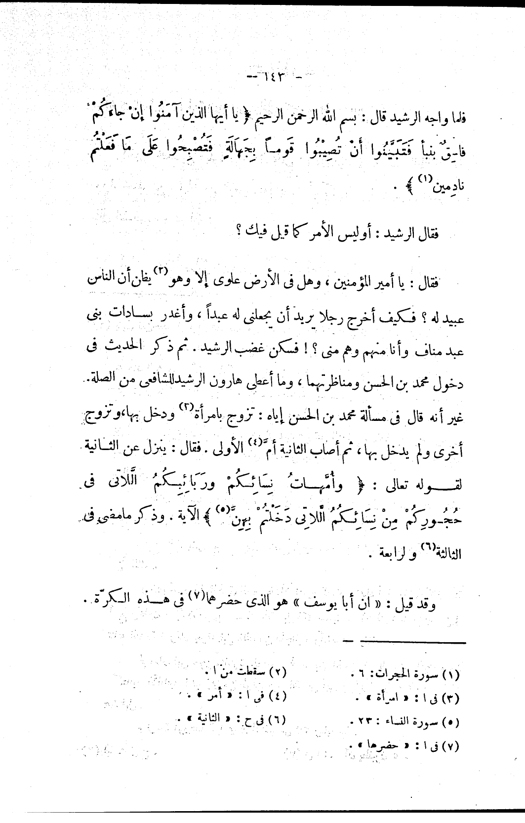 فقال: يا أمير المؤمنين، وهل في الأرض علوي إلا وهو (٢) يظن أن الناس عبيد له؟ فكيف أخرج رجلا يريد أن يجعلني له عبداً، وأغدر بسادات بني عبد مناف وأنا منهم وهم مني؟! فسكن غضب الرشيد. ثم ذكر الحديث في دخول محمد بن الحسن ومناظرتهما، وما أعطى هارون الرشيد للشافعي من الصلة. غير أنه قال في مسألة محمد بن الحسن إياه: تزوج بامرأة (٣) ودخل بها، وتزوج أخرى ولم يدخل بها، ثم أصاب الثانية أمَّ (٤) الأولى. فقال: ينزل عن الثانية لقوله تعالى: {وَأُمَّهَاتُ نِسَائِكُمْ وَرَبَائِبُكُمُ اللَّاتِي فِي حُجُورِكُمْ مِنْ نِسَائِكُمُ اللَّاتِي دَخَلْتُمْ بِهِنَّ (٥)} الآية. وذكر ما مضى في الثالثة (٦) ولرابعة.