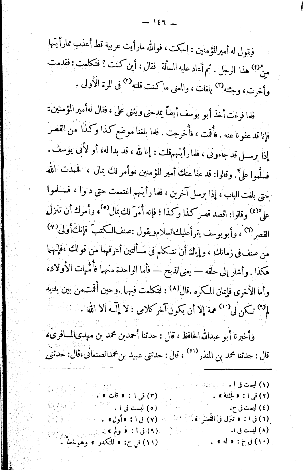فلما فرغت أخذ أبو يوسف أيضاً يمدحني ويثني علي، فقال له أمير المؤمنين: فإنا قد عفونا عنه. فأُقمت، فأُخرجت. فلما بلغنا موضع كذا وكذا من القصر إذا برسل قد جاءوني، فلما رأيتهم قلت: إنا لله، قد بدا له، أو لأبي يوسف. فسلَّموا عليَّ. وقالوا: قد عفا عنك أمير المؤمنين، وأمر لك بمال، فحمدت الله حتى بلغت الباب، إذا برسل آخرين، فلما رأيتهم اغتممت حتى دنوا، فسلموا عليَّ (٤) وقالوا: اقصد قصر كذا وكذا؛ فإنه أَمَرَ لك بمال (٥)، وأمرك أن تنزل القصر (٦)، وأبو يوسف يقرأ عليك السلام ويقول: صنف الكتبَ فإنك أولى (٧) من صنف في زمانك، وإياك أن تتكلم في مسألتين أعرفهما من قولك، فإنهما هكذا. وأشار إلى حلقه – يعني الذبح – فأما الواحدة منها فأُمُّهات الأولاد، وأما الأخرى فإيمان المكره. قال (٨): فتكلمت فيهما. وحين أُقمت من بين يديه لم (٩) تكن لي (١٠) همة إلا أن يكون آخر كلامي: لا إله الا الله.