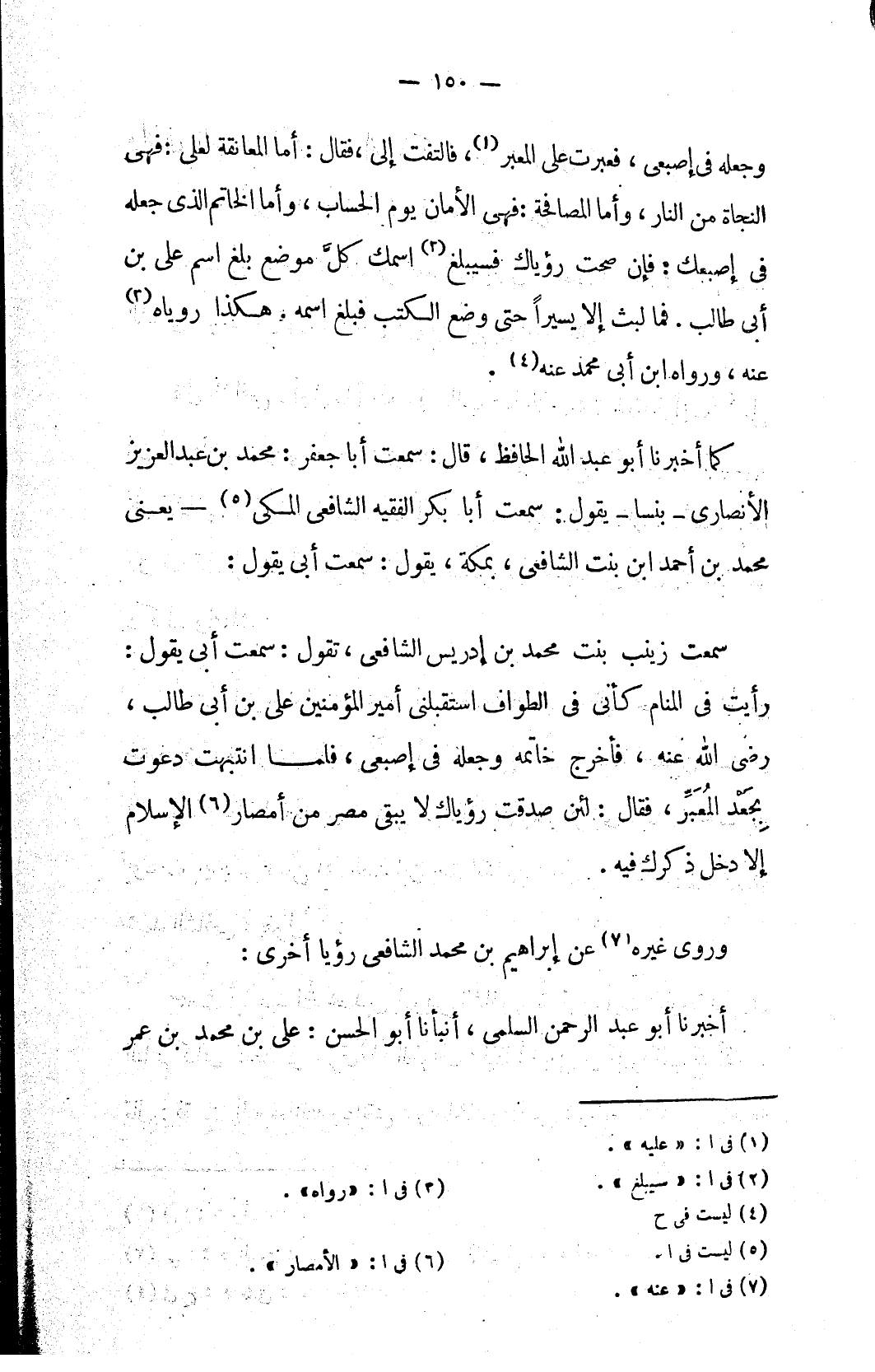 سمعت زينب بنت محمد بن إدريس الشافعي، تقول: سمعت أبي يقول: رأيت في المنام كأني في الطواف استقبلني أمير المؤمنين علي بن أبي طالب، رضي الله عنه، فأخرج خاتمه وجعله في إصبعي، فلما انتبهت دعوت بجَعْد المُعَبِّر، فقال: لئن صدقت رؤياك لا يبقى مصر من أمصار (٦) الإسلام إلا دخل ذكرك فيه.