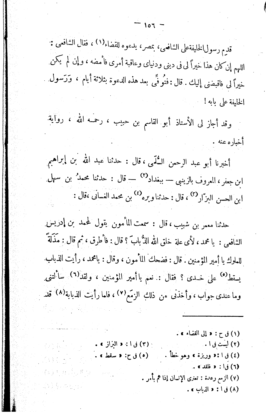 حدثنا معمر بن شيب، قال: سمعت المأمون يقول لمحمد بن إدريس الشافعي: يا محمد، لأي علة خلق الله الذُّبابَ؟ قال: فأطرق، ثم قال: مَذَلةً للملوك يا أمير المؤمنين. قال: فضحك المأمون، وقال: يا محمد، رأيت الذباب يسقط (٥) على خدي؟ فقال: نعم يا أمير المؤمنين، ولقد (٦) سألتني وما عندي جواب، وأخذني من ذلك الزمَع (٧)، فلما رأيت الذباب (٨) قد