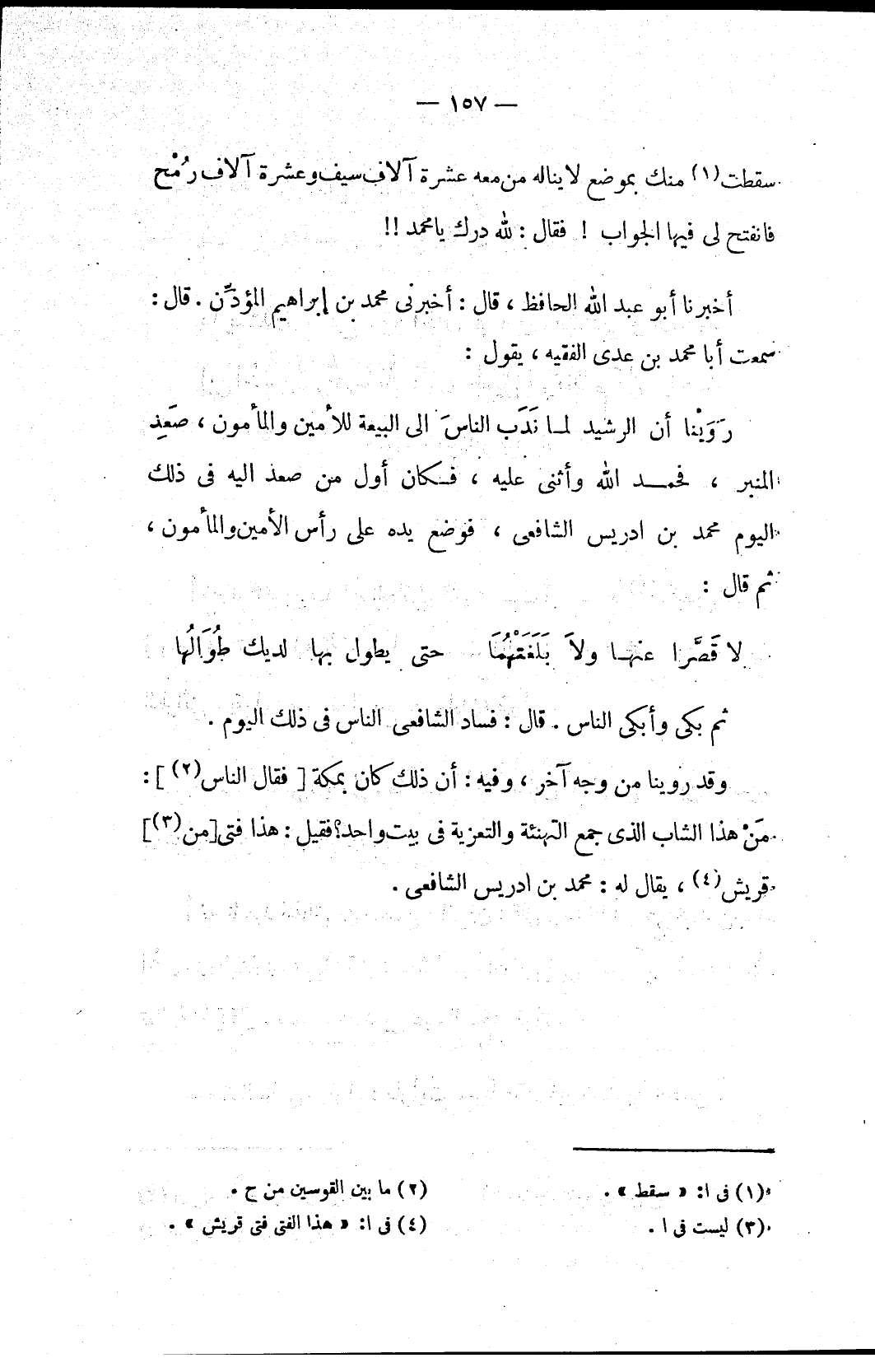 رَوَيْنا أن الرشيد لما نَدَب الناسَ الى البيعة للأمين والمأمون، صَعِد المنبر، فحمد الله وأثنى عليه، فكان أول من صعد اليه في ذلك اليوم محمد بن ادريس الشافعي، فوضع يده على رأس الأمين والمأمون، ثم قال: