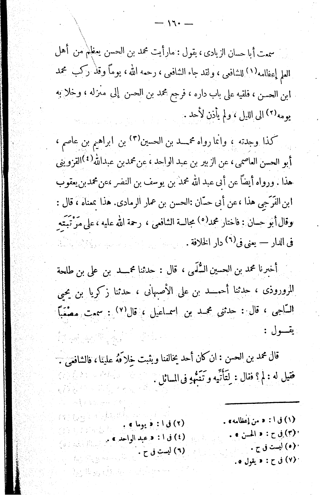 سمعت أبا حسان الزيادي، يقول: ما رأيت محمد بن الحسن يعظم من أهل العلم إعظامه (١) للشافعي، ولقد جاء الشافعي، رحمه الله، يوماً وقد ركب محمد ابن الحسن، فلقيه على باب داره، فرجع محمد بن الحسن إلى منزله، وخلا به يومه (٢) الى الليل، ولم يأذن لأحد.