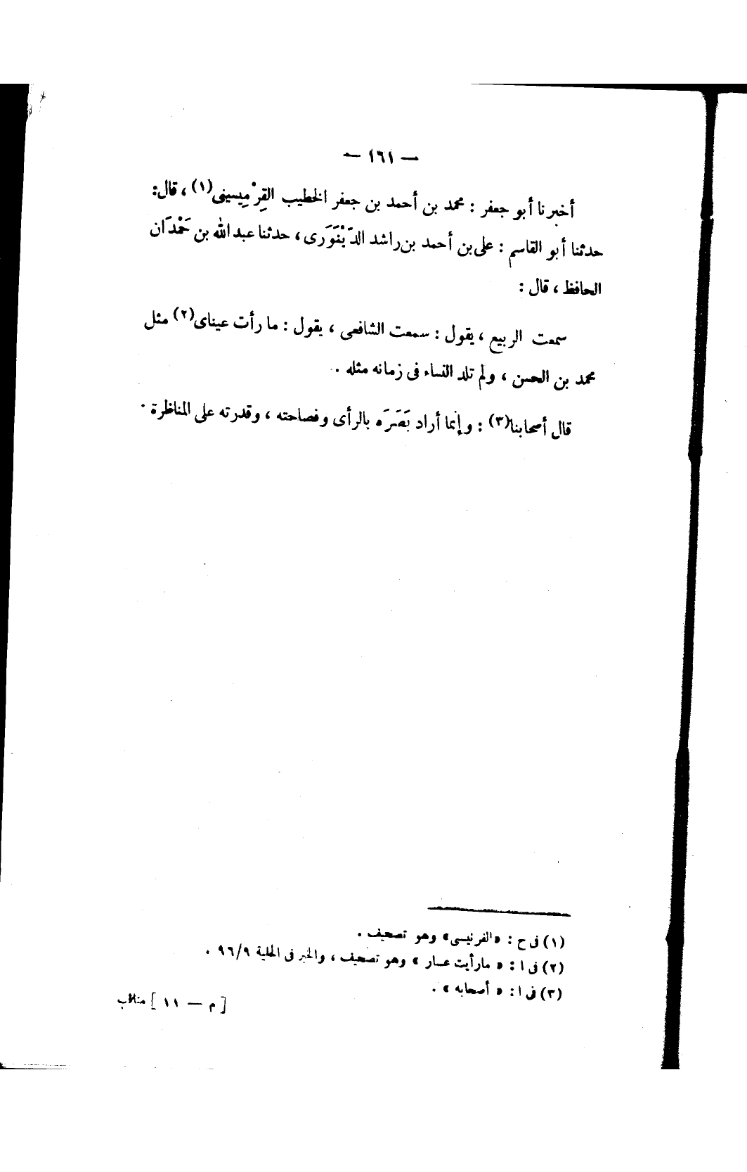 سمعت الربيع، يقول: سمعت الشافعي، يقول: ما رأت عيناي (٢) مثل محمد بن الحسن، ولم تلد النساء في زمانه مثله.