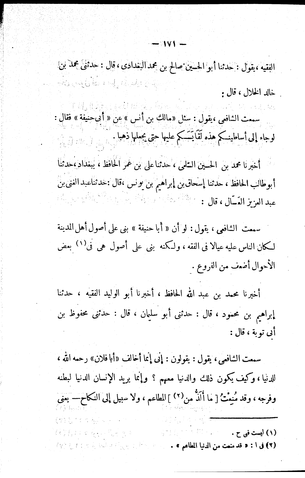 سمعت الشافعي، يقول: يقولون: إني إنما أخالف «أبا فلان» رحمه الله، للدنيا، وكيف يكون ذلك والدنيا معهم؟ وإنما يريد الإنسان الدنيا لبطنه وفرجه، وقد مُنِعْتُ [ما أَلَذُّ من (٢)] المطاعم، ولا سبيل إلى النكاح – يعني