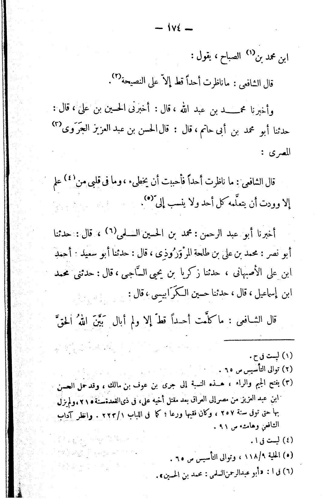 أخبرنا أبو عبد الرحمن: محمد بن الحسين السلمي (٦)، قال: حدثنا أبو نصر: محمد بن علي بن طلحة المرْوَرُوذِي، قال: حدثنا أبو سعيد: أحمد ابن علي الأصبهاني، حدثنا زكريا بن يحيى السَّاجي، قال: حدثني محمد ابن إسماعيل، قال حدثنا حسين الكَرَابيسِي، قال: