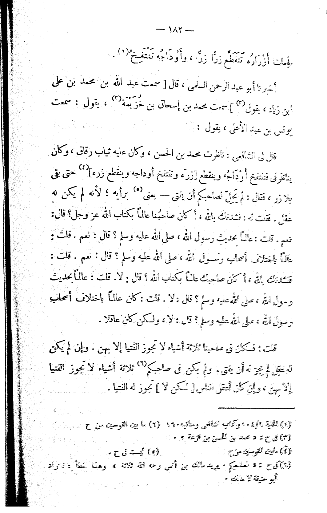 قلت: فكان في صاحبنا ثلاثة أشياء لا تجوز الفتيا إلا بهن. وإن لم يكن له عقل لم يجز له أن يفتي. ولم يكن في صاحبكم (٦) ثلاثة أشياء لا تجوز الفتيا إلا بهن، وإن كان أعقل الناس [لكن لا] تجوز له الفتيا.