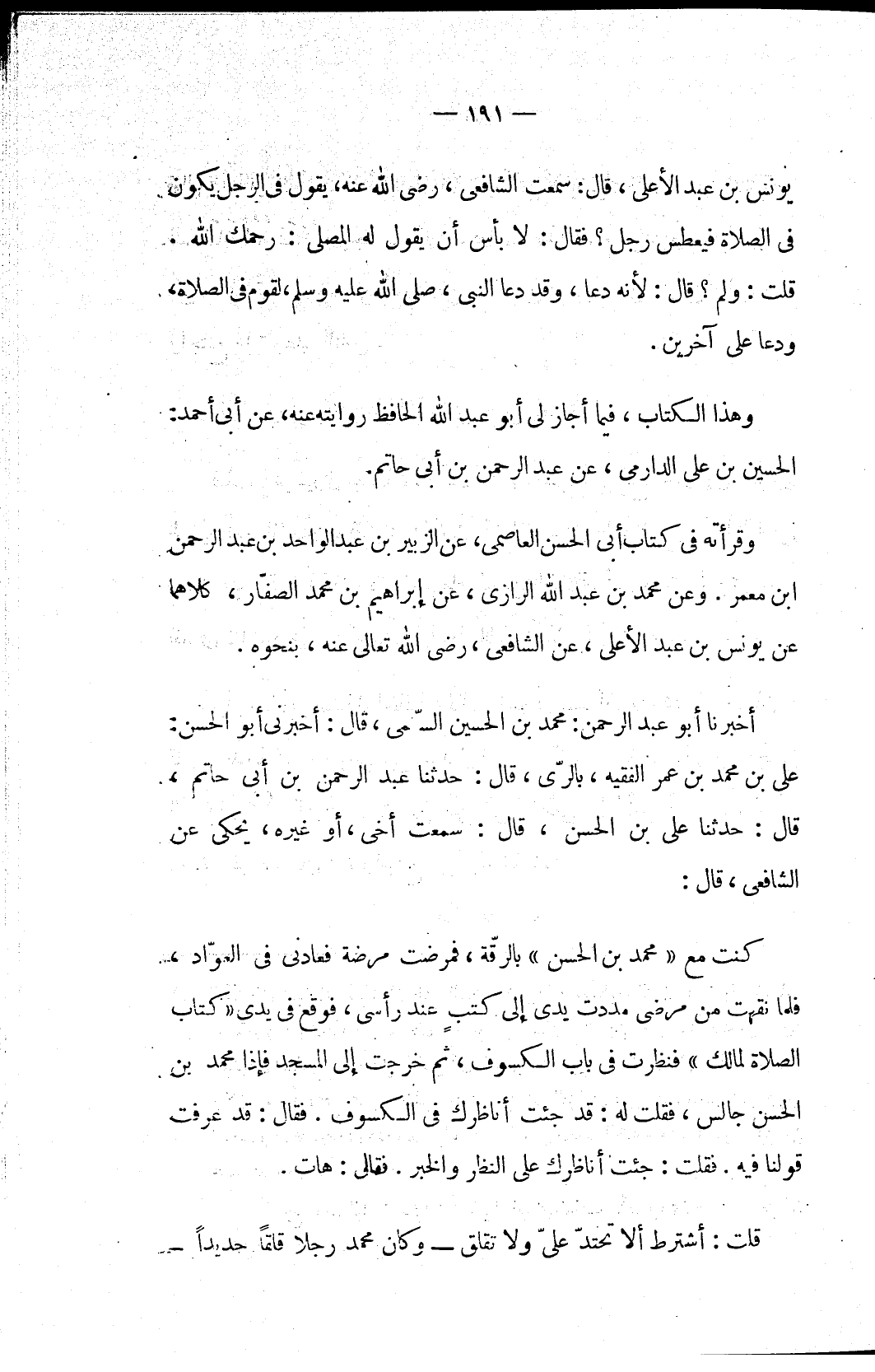 كنت مع «محمد بن الحسن» بالرقّة، فمرضت مرضة فعادني في العوّاد، فلما نقهت من مرضى مددت يدي إلى كتبٍ عند رأسي، فوقع في يدي «كتاب الصلاة لمالك» فنظرت في باب الكسوف. فقال: قد عرفت قولنا فيه. فقلت: جئت أناظرك على النظر والخبر. فقال: هات.