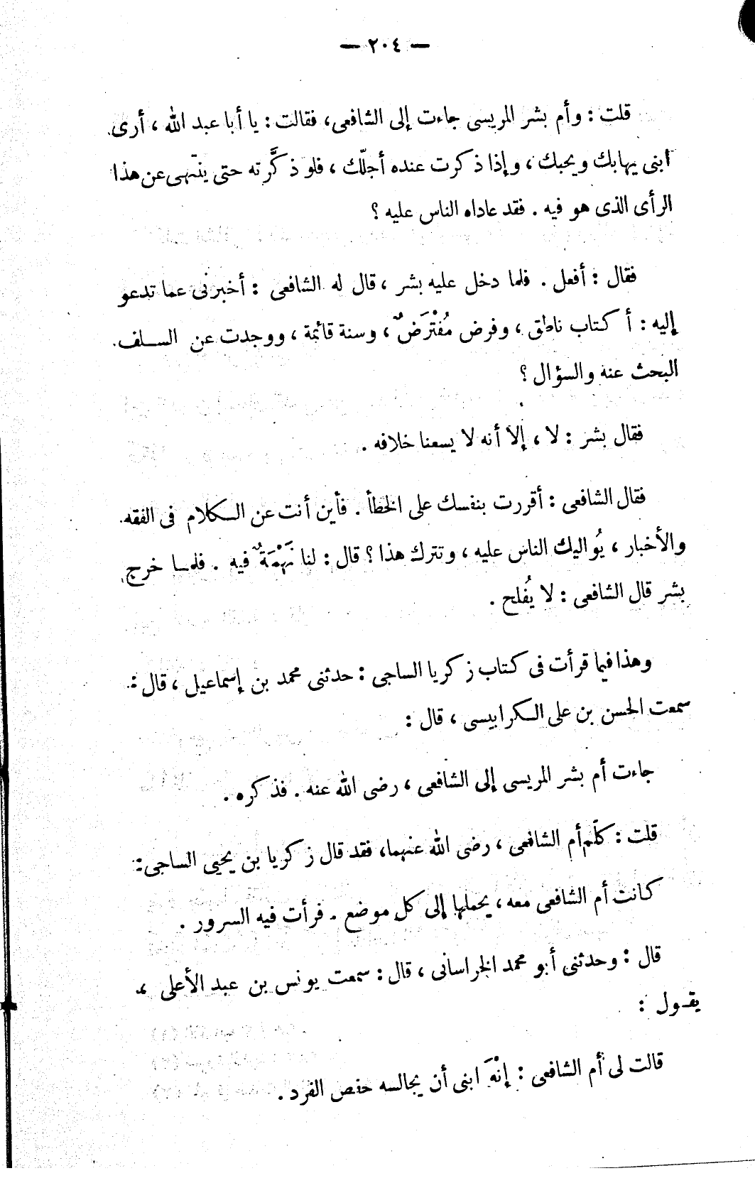 قلت: وأم بشر المريسي جاءت إلى الشافعي، فقالت: يا أبا عبد الله، أرى ابني يهابك ويحبك، وإذا ذكرت عنده أجلّك، فلو ذكَّرته حتى ينتهي عن هذا الرأي الذي هو فيه. فقد عاداه الناس عليه؟