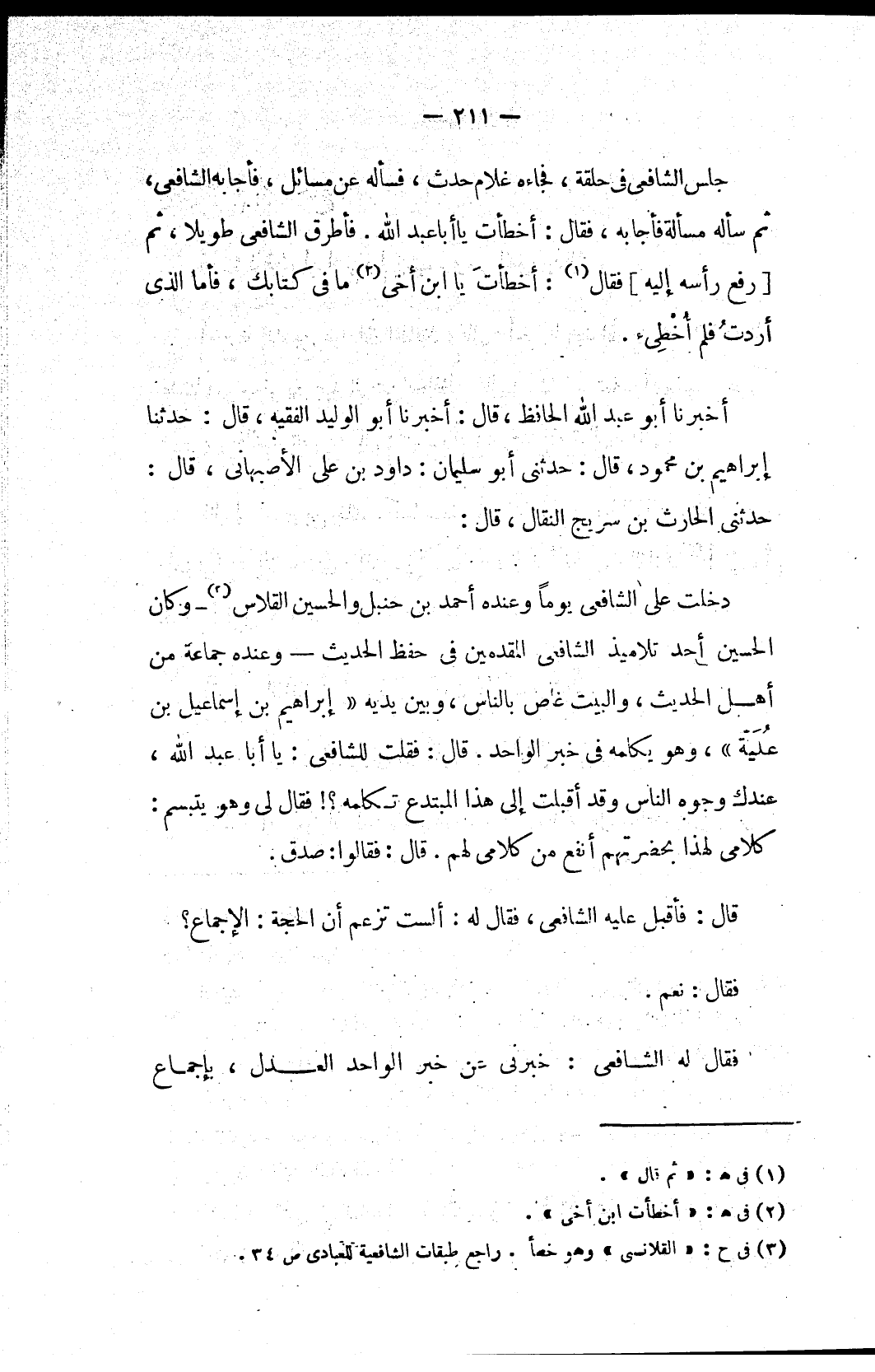 فقال له الشافعي: خبرني عن خبر الواحد العدل، بإجماع
