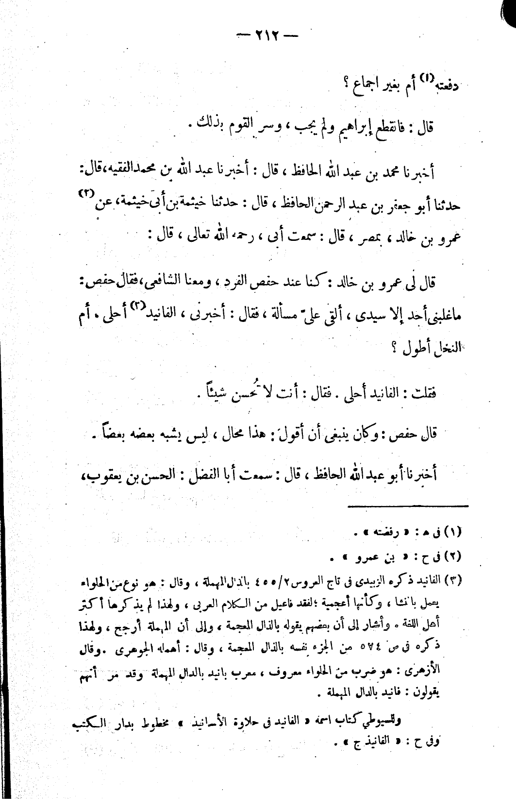 وللسيوطي كتاب اسمه «الفانيد في حلاوة الأسانيد» مخطوط بدار الكتب وفي ح: «الفانيد ج».
