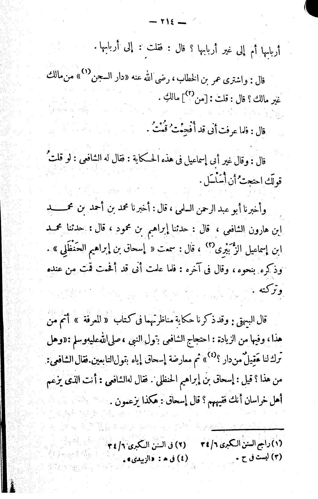 قال البيهقي: وقد ذكرنا حكاية مناظرتهما في كتاب «المعرفة» أتم من هذا، وفيها من الزيادة: احتجاج الشافعي بقول النبي، صلى الله عليه وسلم: «وهل ترك لنا عَقِيلٌ من دار؟ (٤)» ثم معارضة إسحاق إياه بقول التابعين. فقال الشافعي: من هذا؟ قيل: إسحاق بن إبراهيم الحنظلي. فقال له الشافعي: أنت الذي يزعم أهل خراسان أنك فقيههم؟ قال إسحاق: هكذا يزعمون.