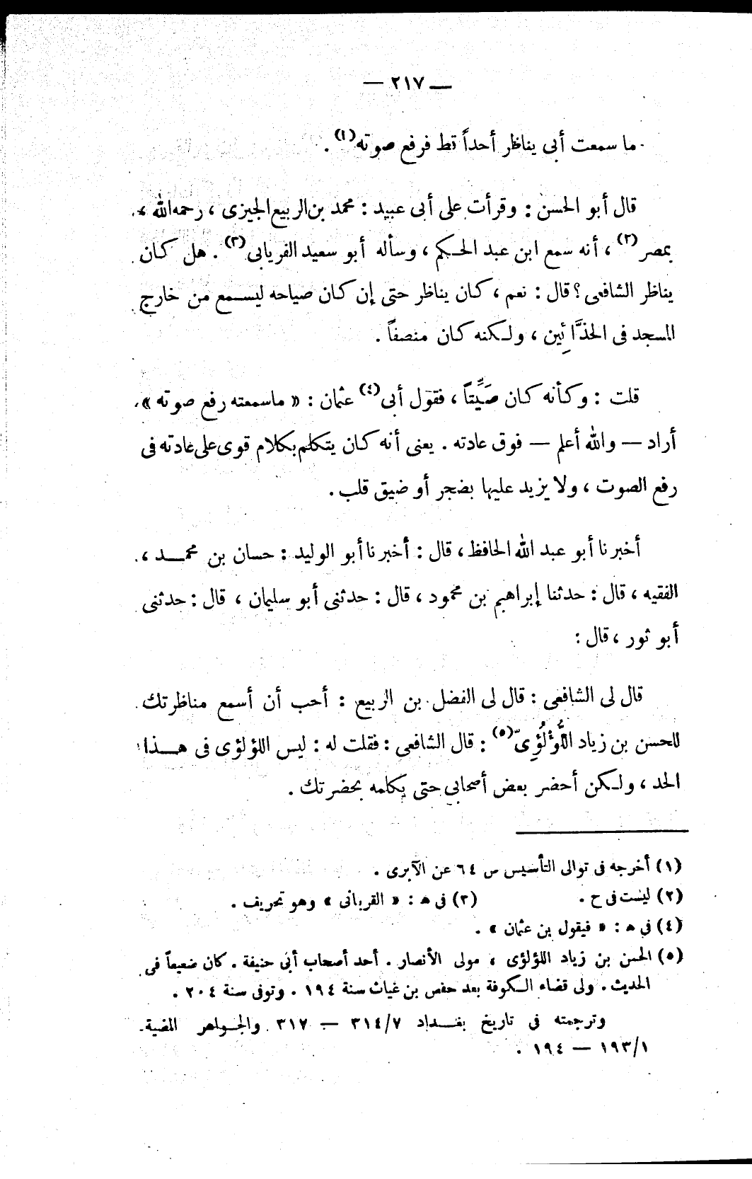 (٥) الحسن بن زياد اللؤلؤي، مولى الأنصار. أحد أصحاب أبي حنيفة. كان ضعيفاً في الحديث. ولى قضاء الكوفة بعد حفص بن غياث سنة ١٩٤. وتوفى سنة ٢٠٤.