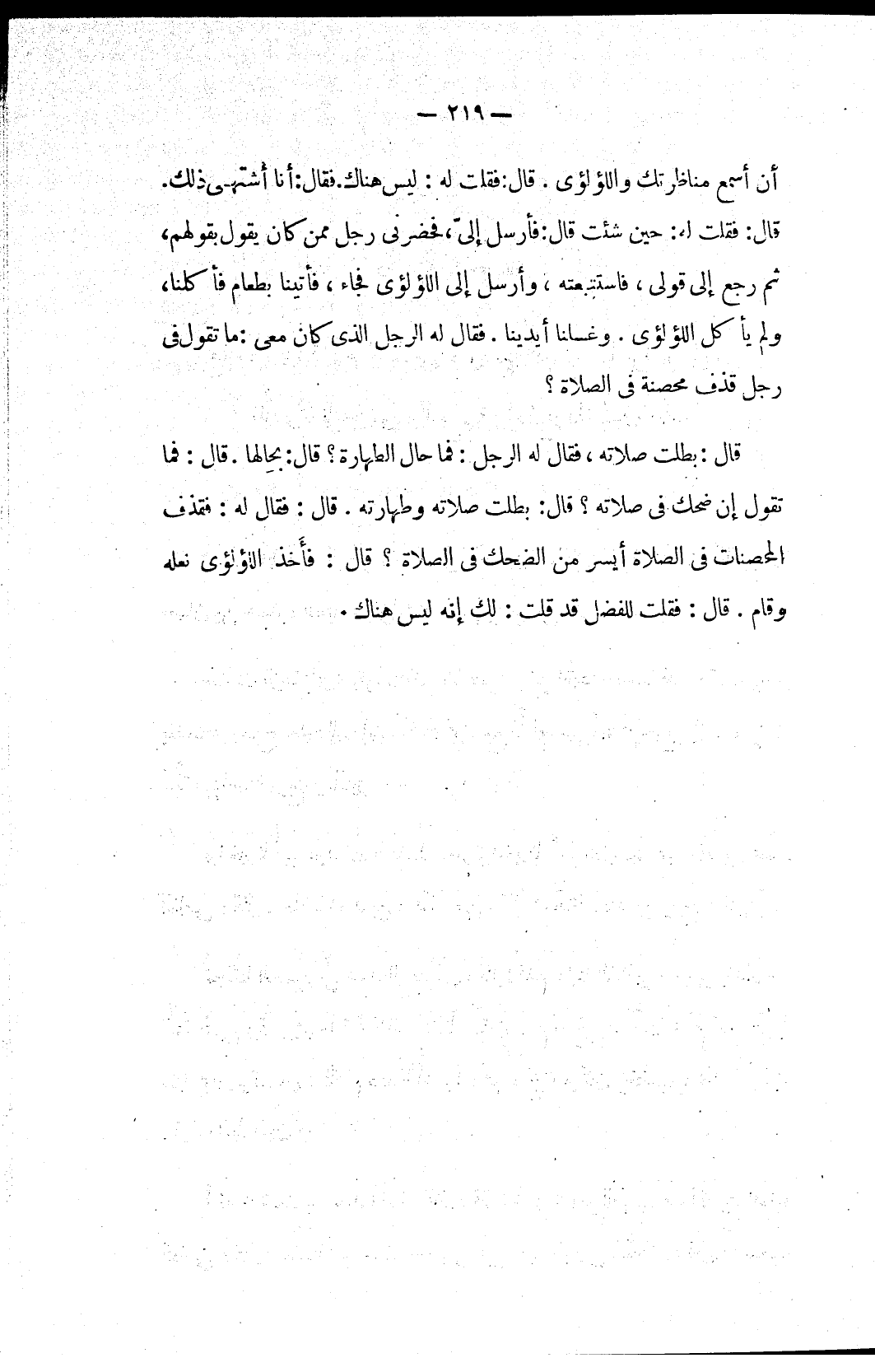 قال: بطرت صلاته، فقال له الرجل: فما حال الطهارة؟ قال: بحالها. قال: فما تقول إن ضحك في صلاته؟ قال: بطلت صلاته وطهارته. قال: فقال له: فقذف المحصنات في الصلاة أيسر من الضحك في الصلاة؟ قال: فأَخذ اللؤلؤي نعله وقام. قال: فقلت للفضل قد قلت: لك إنه ليس هناك.
