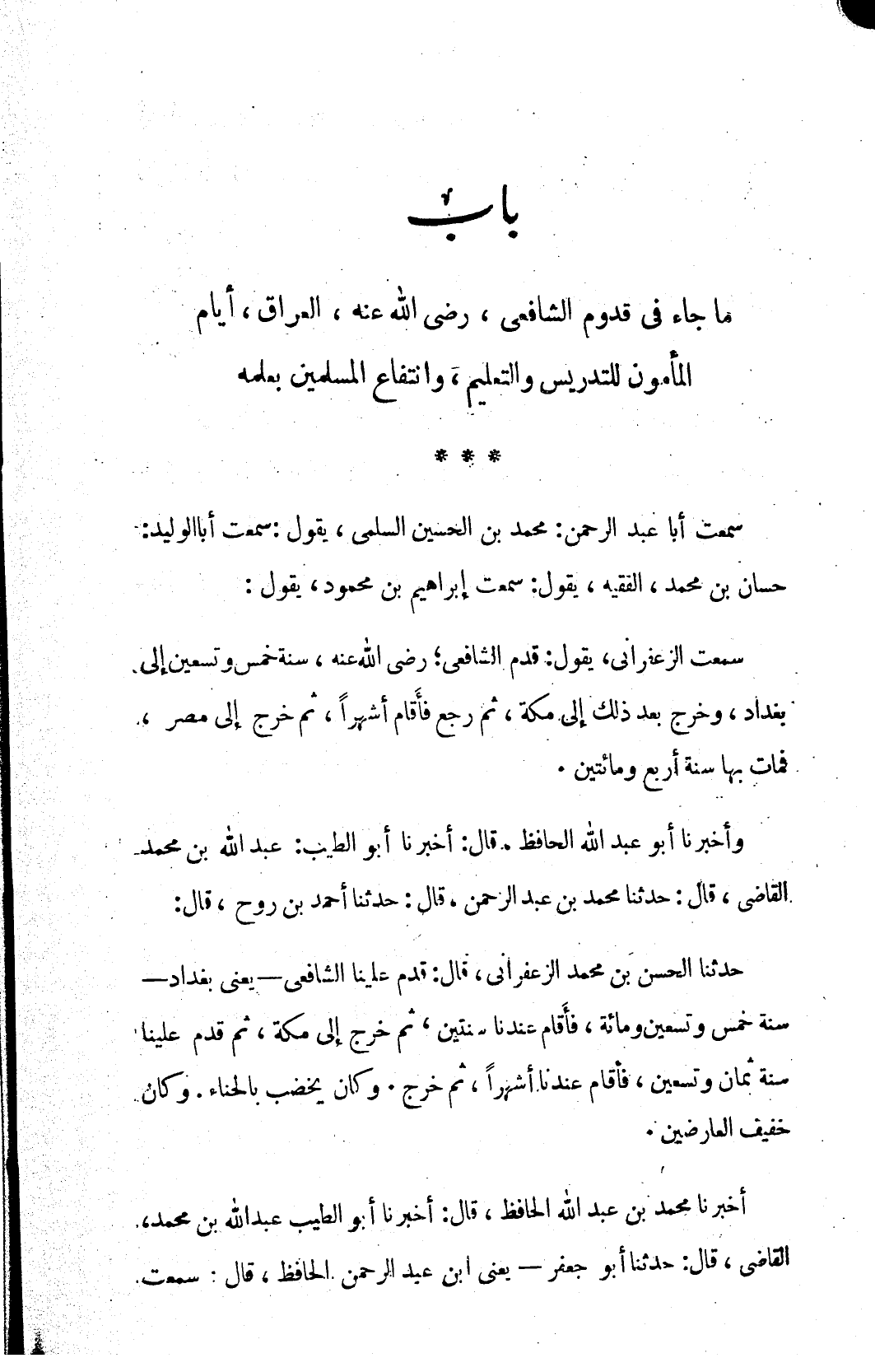 ما جاء في قدوم الشافعي، رضي الله عنه، العراق، أيام المأمون للتدريس والتعليم، وانتفاع المسلمين بعلمه