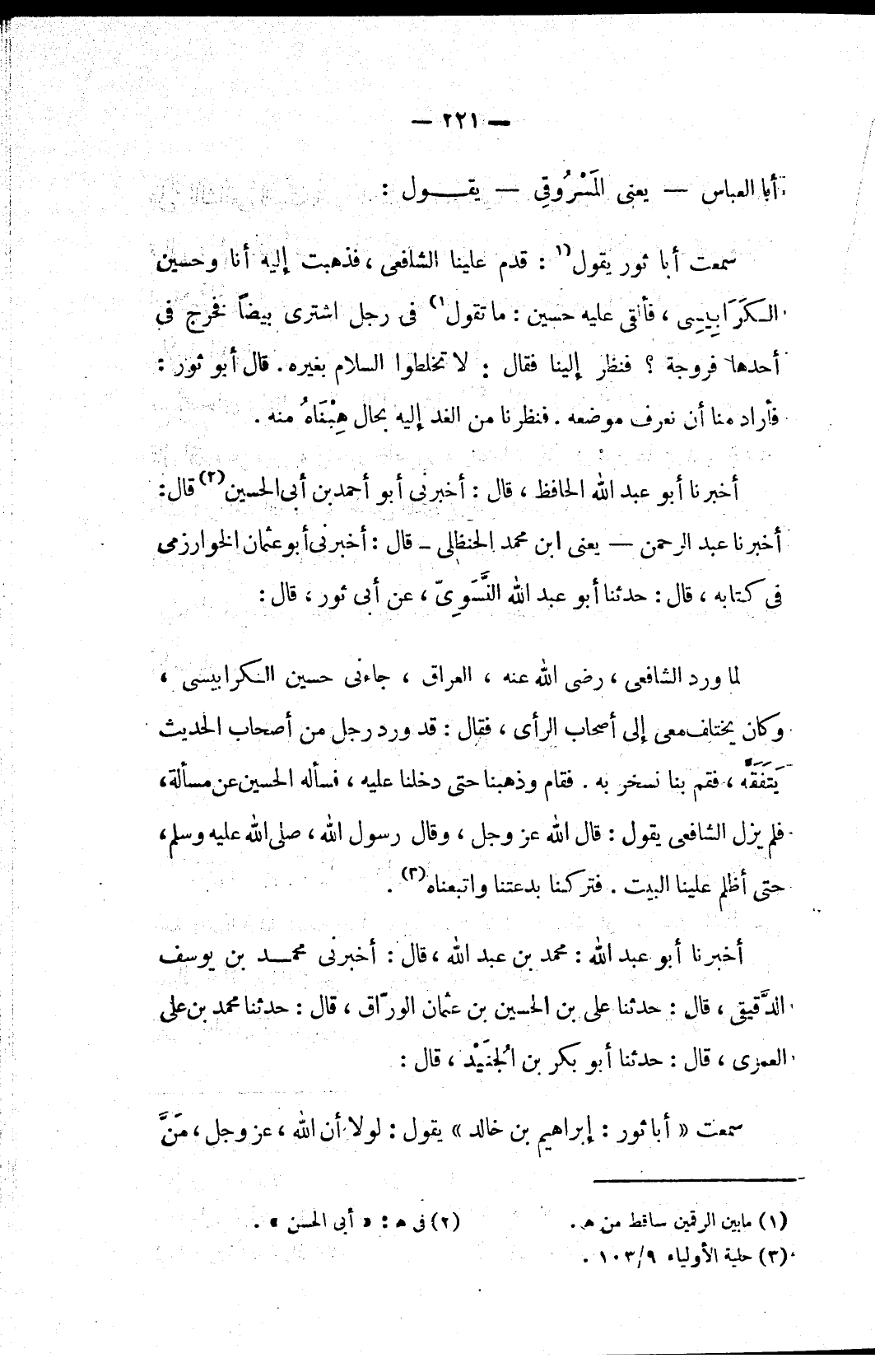 أخبرنا أبو عبد الله الحافظ، قال: أخبرني أبو أحمد بن أبي الحسين (٢) قال: أخبرنا عبد الرحمن - يعني ابن محمد الحنظلي - قال: أخبرني أبو عثمان الخوارزمي في كتابه، قال: حدثنا أبو عبد الله النَّسَوِيّ، عن أبي ثور، قال: