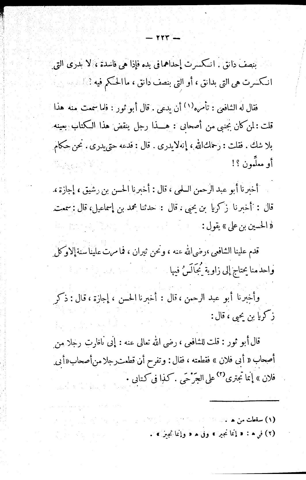 قال أبو ثور: قلت للشافعي، رضي الله تعالى عنه: إني ناظرت رجلا من أصحاب «أبي فلان» فقطعته، فقال: وتفرح أن قطعت رجلا من أصحاب «أبي فلان» إنما تجتري (٢) على الجَرْحَي. كذا في كتابي.