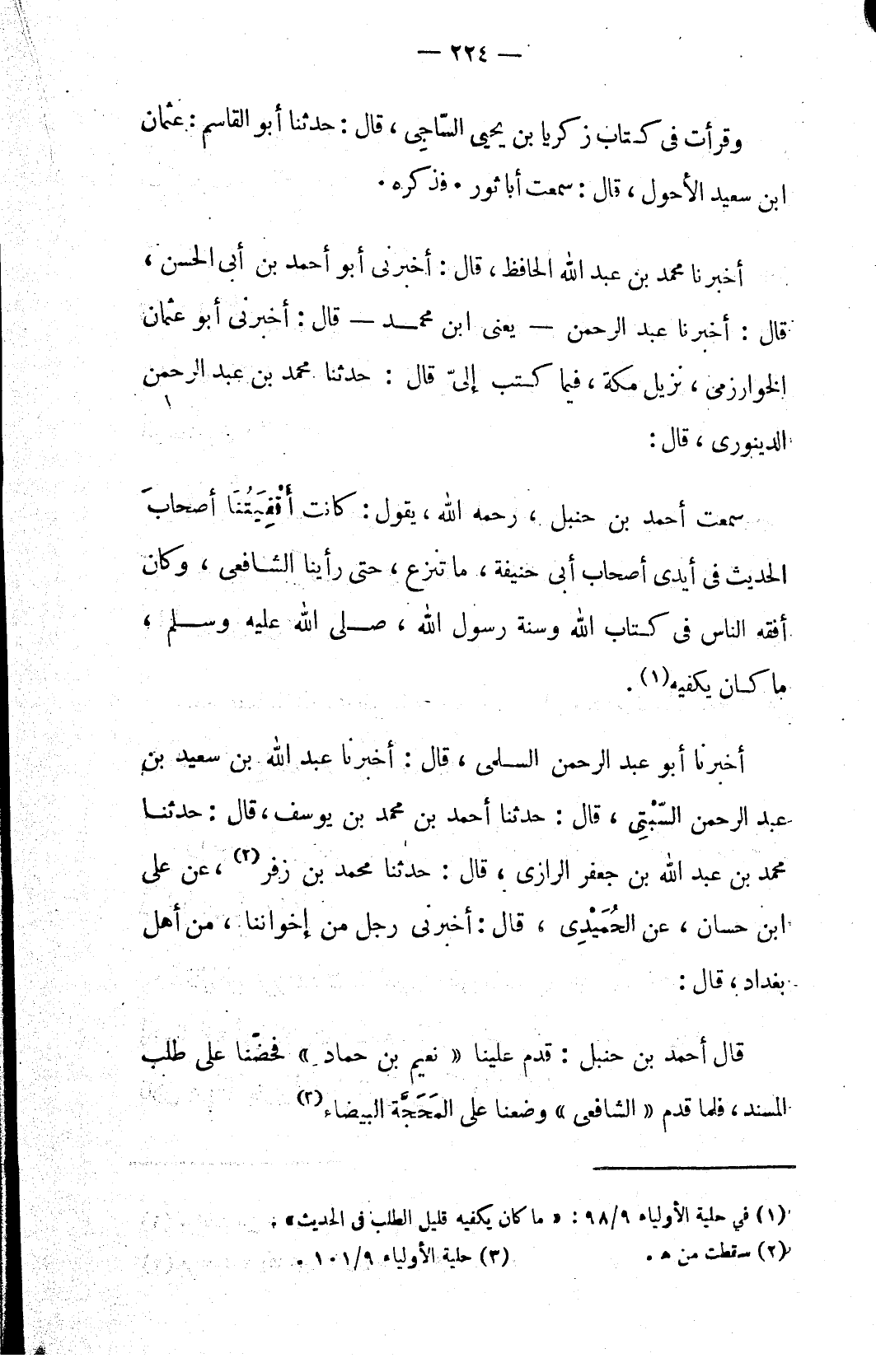 قال أحمد بن حنبل: قدم علينا «نعيم بن حماد» فحضّنا على طلب المسند، فلما قدم «الشافعي» وضعنا على المَحَجَّة البيضاء (٣)