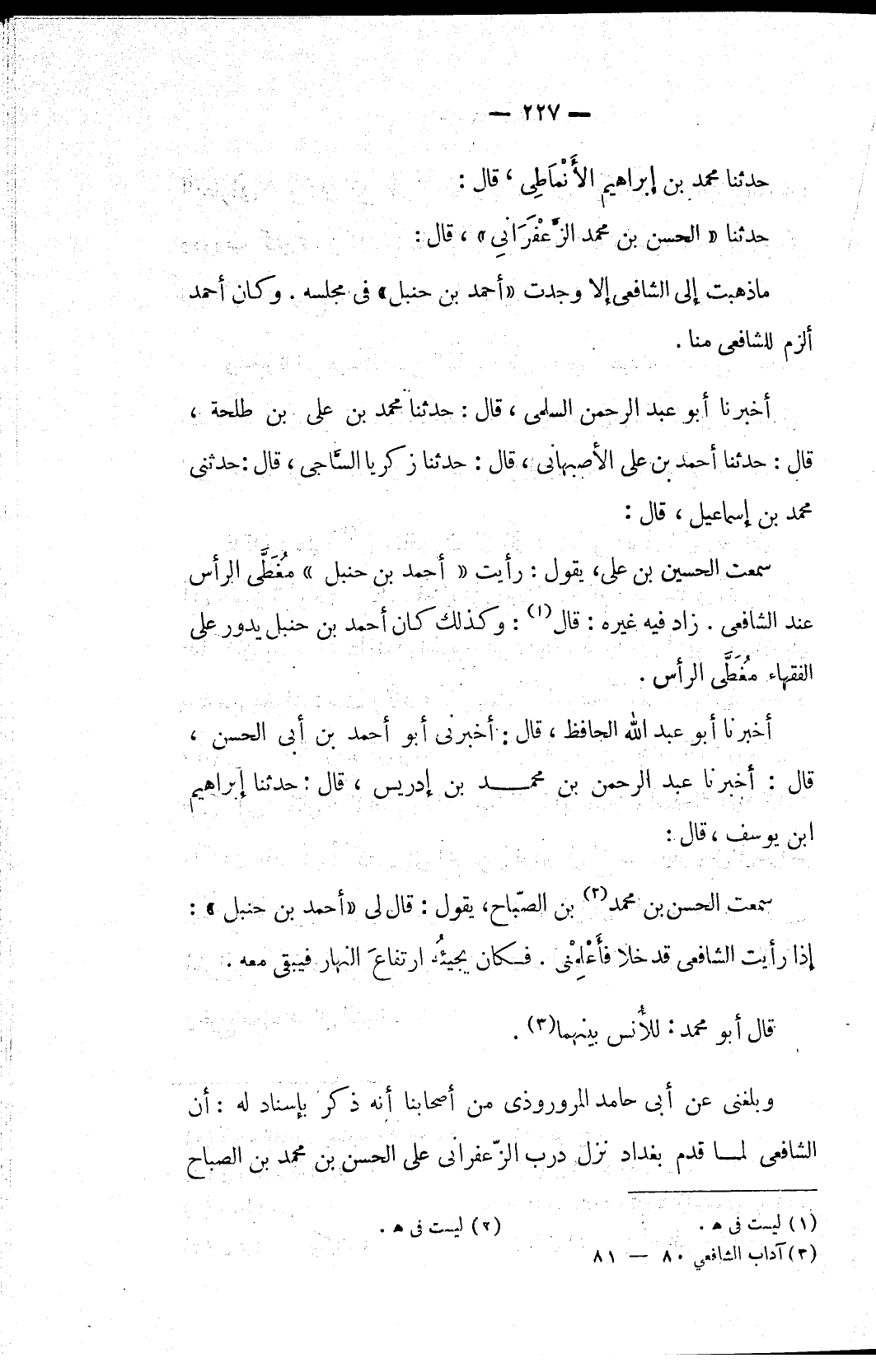 سمعت الحسين بن علي، يقول: رأيت «أحمد بن حنبل» مُغَطَّى الرأس عند الشافعي. زاد فيه غيره: قال (١): وكذلك كان أحمد بن حنبل يدور على الفقهاء مُغَطَّى الرأس.