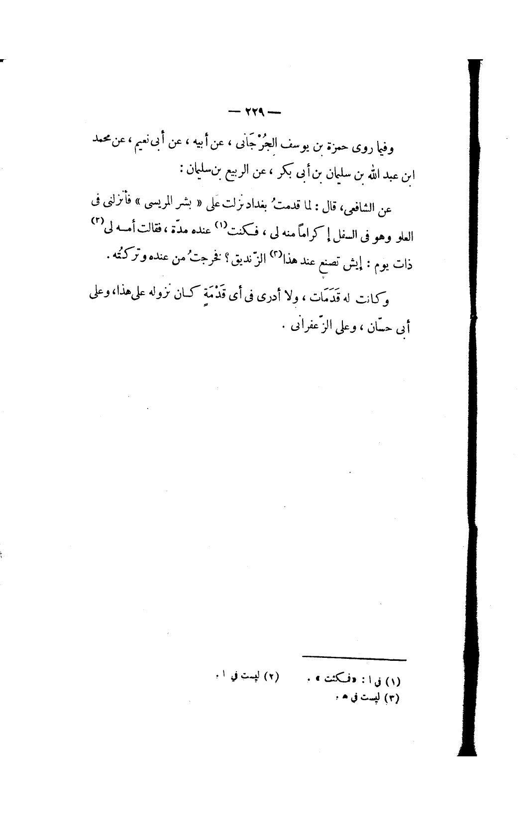 وفيما روى حمزة بن يوسف الجُرْجَاني، عن أبيه، عن أبي نعيم، عن محمد ابن عبد الله بن سليمان بن أبي بكر، عن الربيع بن سليمان: