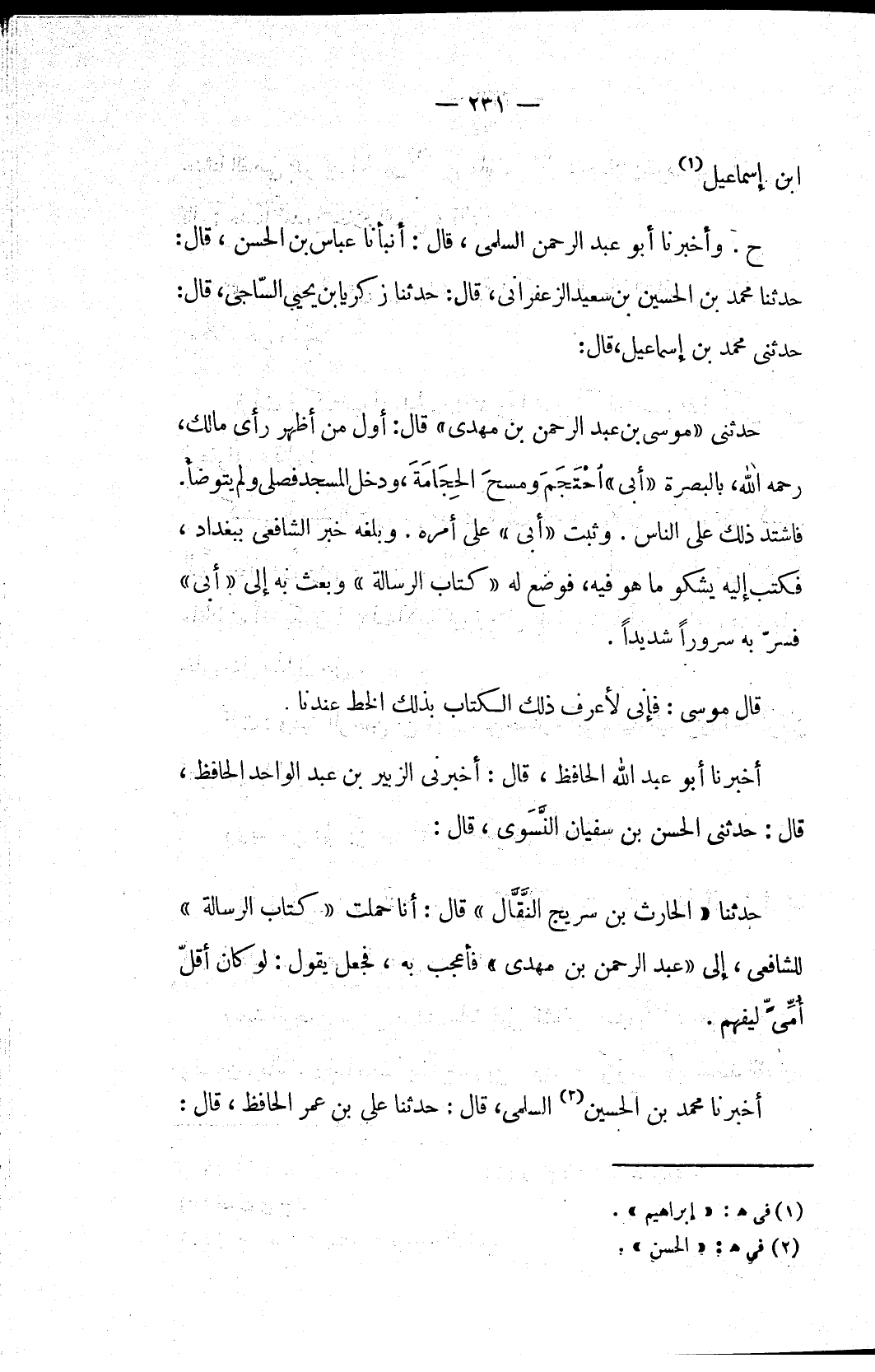 حدثني «موسى بن عبد الرحمن بن مهدي» قال: أول من أظهر رأي مالك، رحمه الله، بالبصرة «أبي» أحْتَجَمَ ومسحَ الحِجَامَةَ، ودخل المسجد فصلى ولم يتوضأ. فاشتد ذلك على الناس. وثبت «أبي» على أمره. وبلغه خبر الشافعي ببغداد، فكتب إليه يشكو ما هو فيه، فوضع له «كتاب الرسالة» وبعث به إلى «أبي» فسرّ به سروراً شديداً.